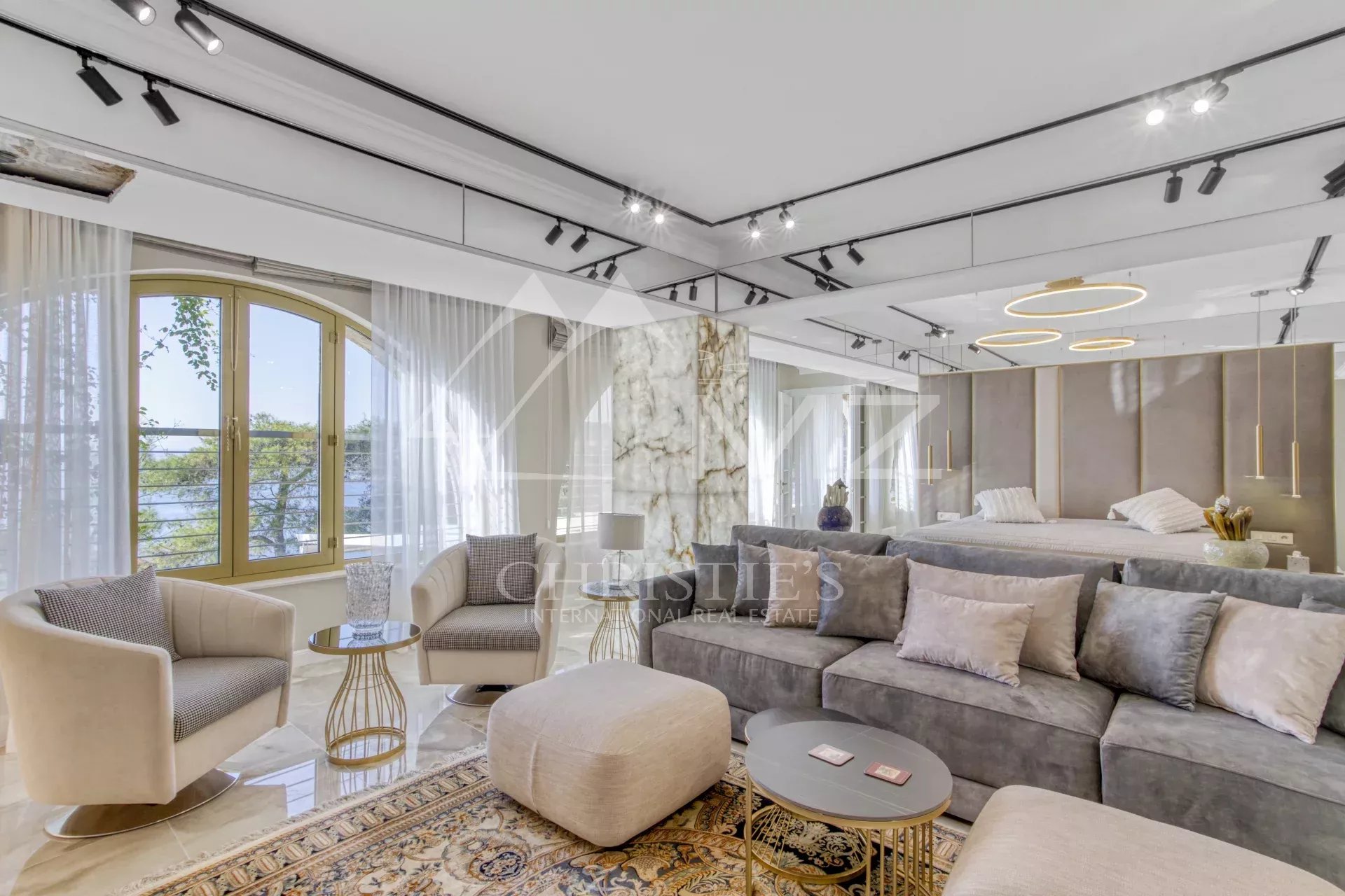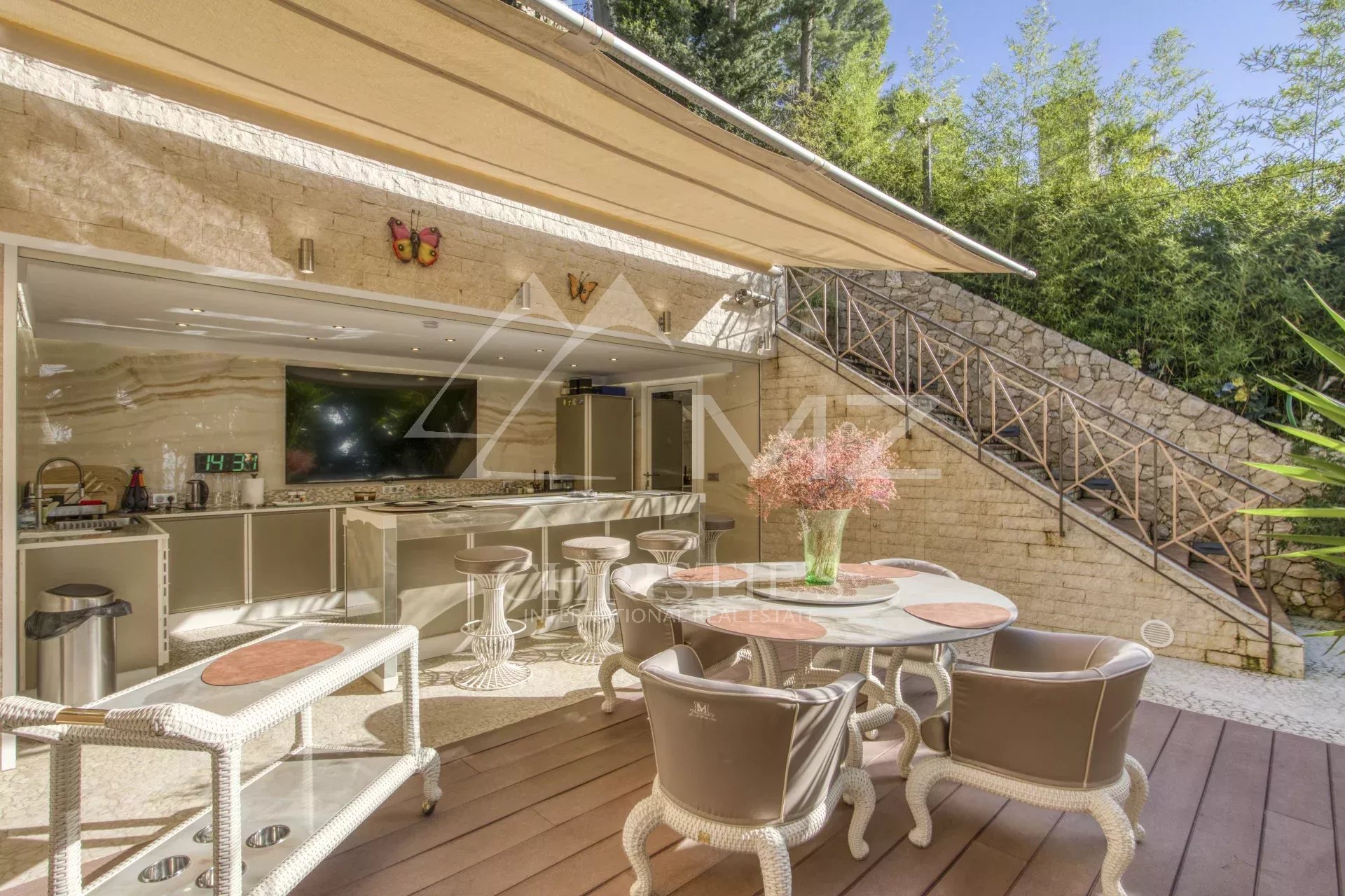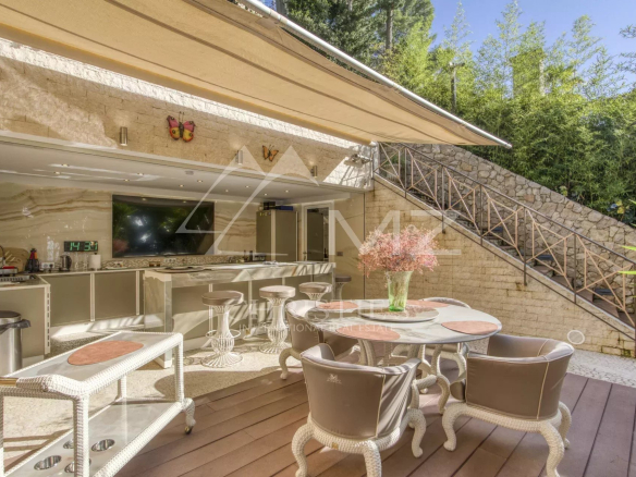 Les jardins, paysagés avec soin, reflètent l’élégance et la perfection de cette propriété. Enfin, deux studios indépendants près de l’entrée de la villa sont réservés au personnel pour assurer une sécurité optimale. Un garage fermé pour deux véhicules et des parkings extérieurs complètent ce bien d’exception.