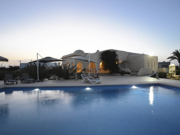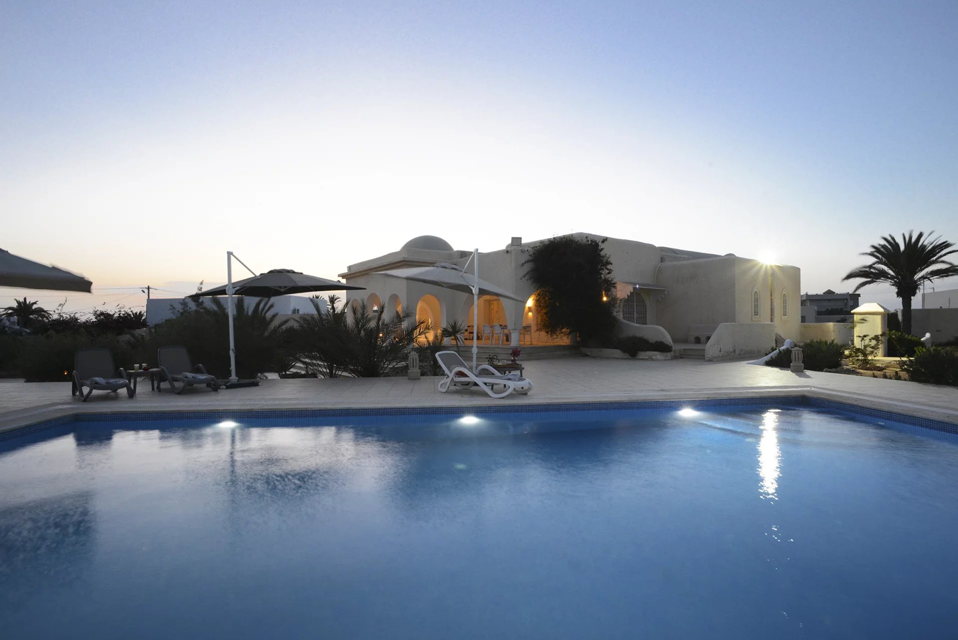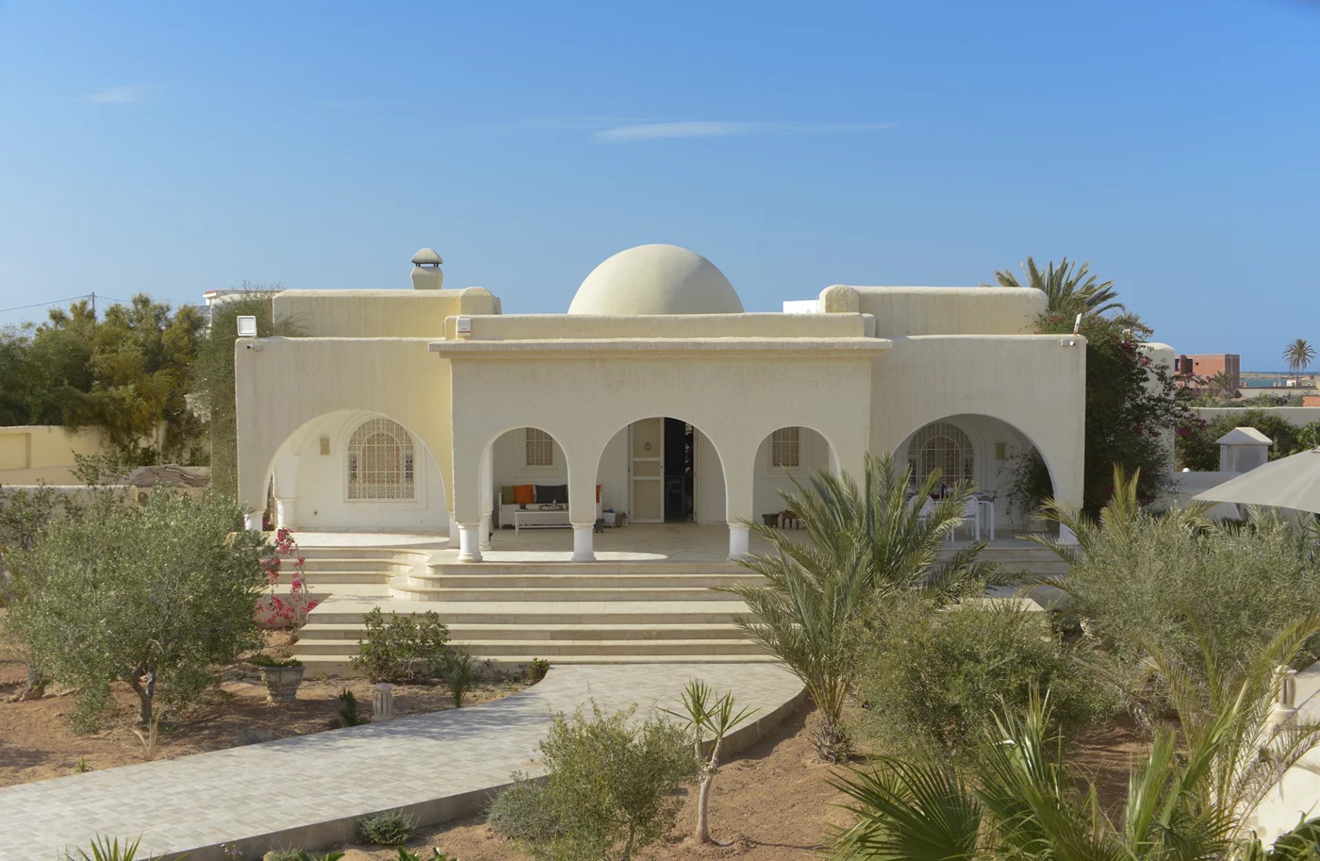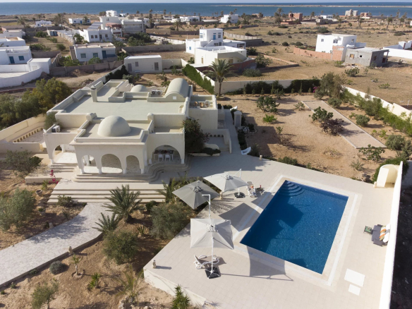 Domaine pieds dans l’eau à Bounouma, îles Kerkennah, Sfax, Tunisie. 480 m², 2 villas indépendantes, piscine, rooftop, jardin 5 000 m², 30 m de la plage. 860 000 € FAI.