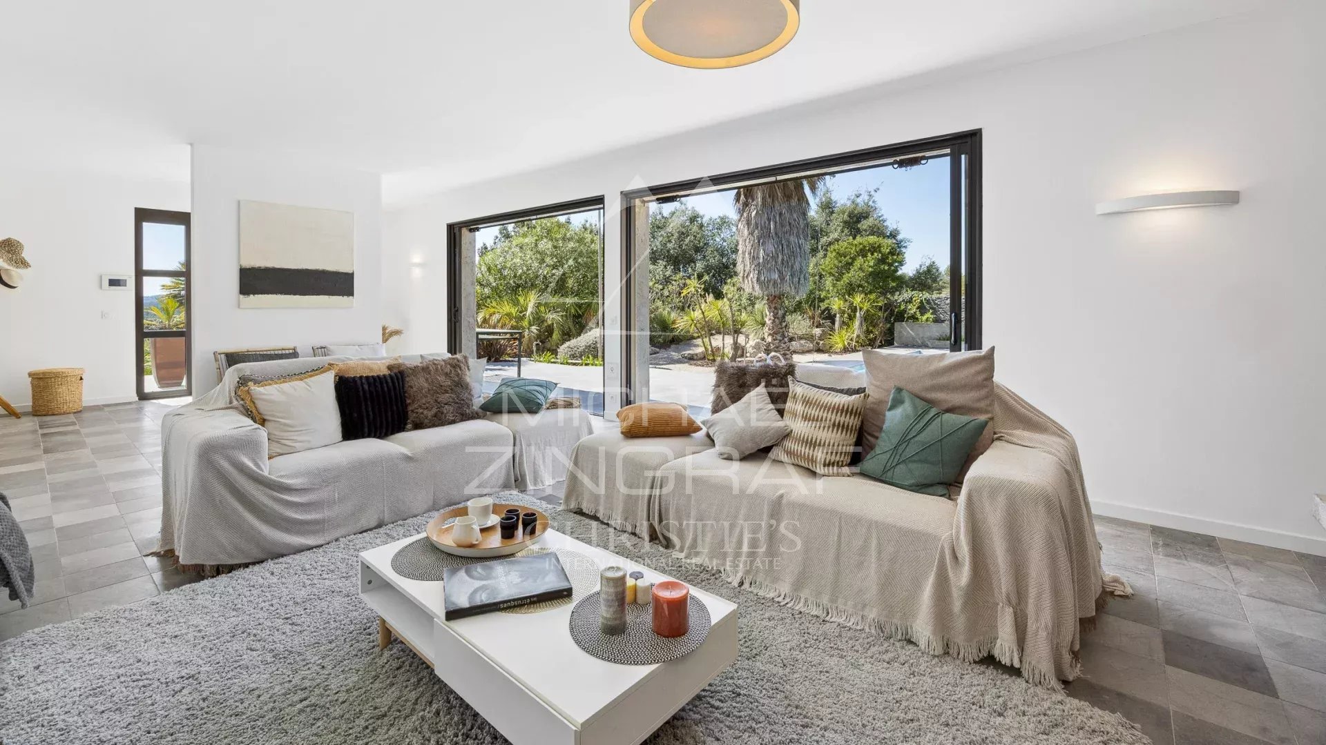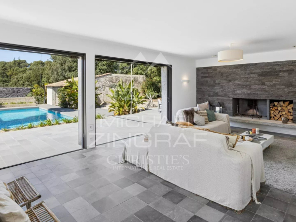 Cette propriété de standing à Biot offre de généreux volumes de réception, ouverts sur les extérieurs, favorisant une parfaite continuité intérieur / extérieur, idéale pour un art de vivre méditerranéen.