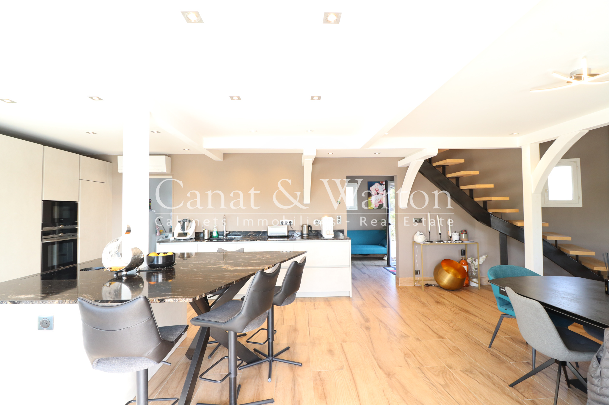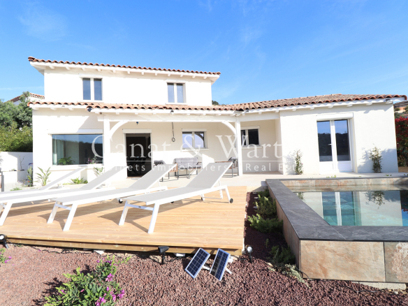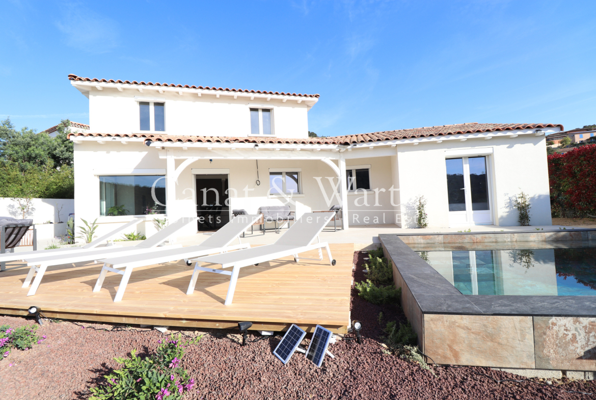CANAT & WARTON Golfe de Saint Tropez, présente cette magnifique villa moderne & rénovée à Cavalaire d’une superficie de 140 m2, érigée sur un terrain de 593 m2. Elle offre une vue imprenable sur les collines environnantes et la mer. En pénétrant dans la villa, vous serez accueilli par une entrée avec des placards, menant à un spacieux salon/ salle à manger et une cuisine ouverte toute équipée qui s’ouvrent sur une élégante terrasse couverte. Vous serez séduit par la première chambre qui offre une vue directe sur la piscine et la terrasse. La chambre est également équipée d’une salle de douche. A l’étage, cette villa rénovée est composée de 3 chambres supplémentaires, toutes équipées de salles de douche modernes. Cette villa est entièrement climatisée. Vous serez également impressionné par la hauteur sous plafond avec des poutres apparentes qui ajoutent un charme incontestable à la villa. Enfin, la villa dispose d’une terrasse extérieure qui donne sur un magnifique jardin paysager et avec une piscine. Flavien GRANDMAIRE, directeur de l’agence CANAT & WARTON Golfe de Saint Tropez est à votre disposition au 06 47 52 46 42 cavalaire@canatwarton.com. WE SPEAK ENGLISH-WIR SPRECHEN DEUTSCH. Les informations sur les risques auxquels ce bien est exposé sont disponibles sur le site Géorisques www.georisques.gouv.fr