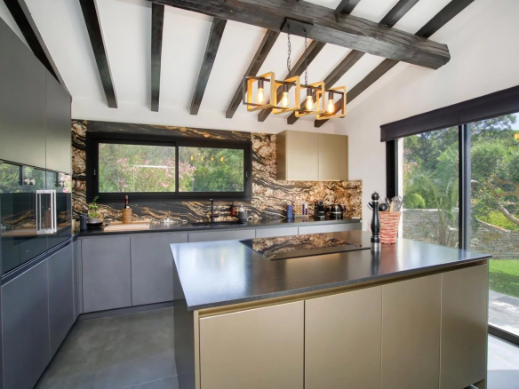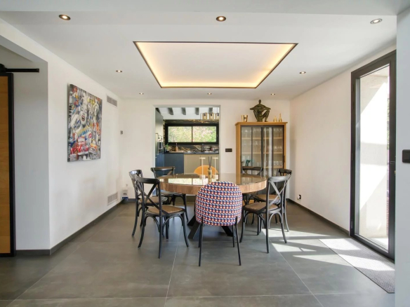 La salle à manger communique avec une élégante cuisine américaine équipée Gaggenau, parfaite pour les amoureux de gastronomie.