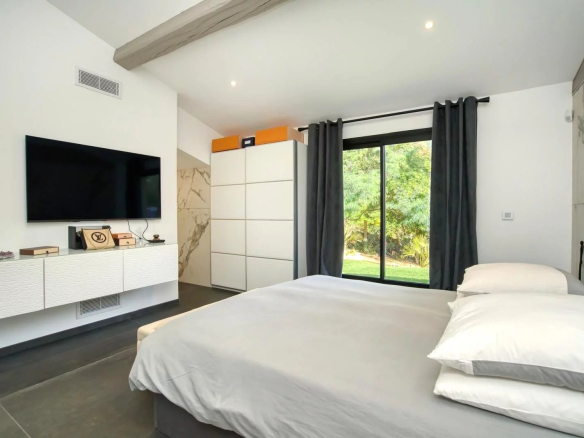 Les extérieurs ont été travaillés avec soin sur plus de 1 700 m² de terrain paysagé, planté d’essences méditerranéennes. La piscine à débordement s’intègre dans un décor apaisant, bordée d’espaces bains de soleil pour prolonger les journées d’été. Un garage double et des parkings complètent ce bien, tandis que les équipements haut de gamme — climatisation réversible, système d’alarme, portail motorisé — assurent un confort moderne.