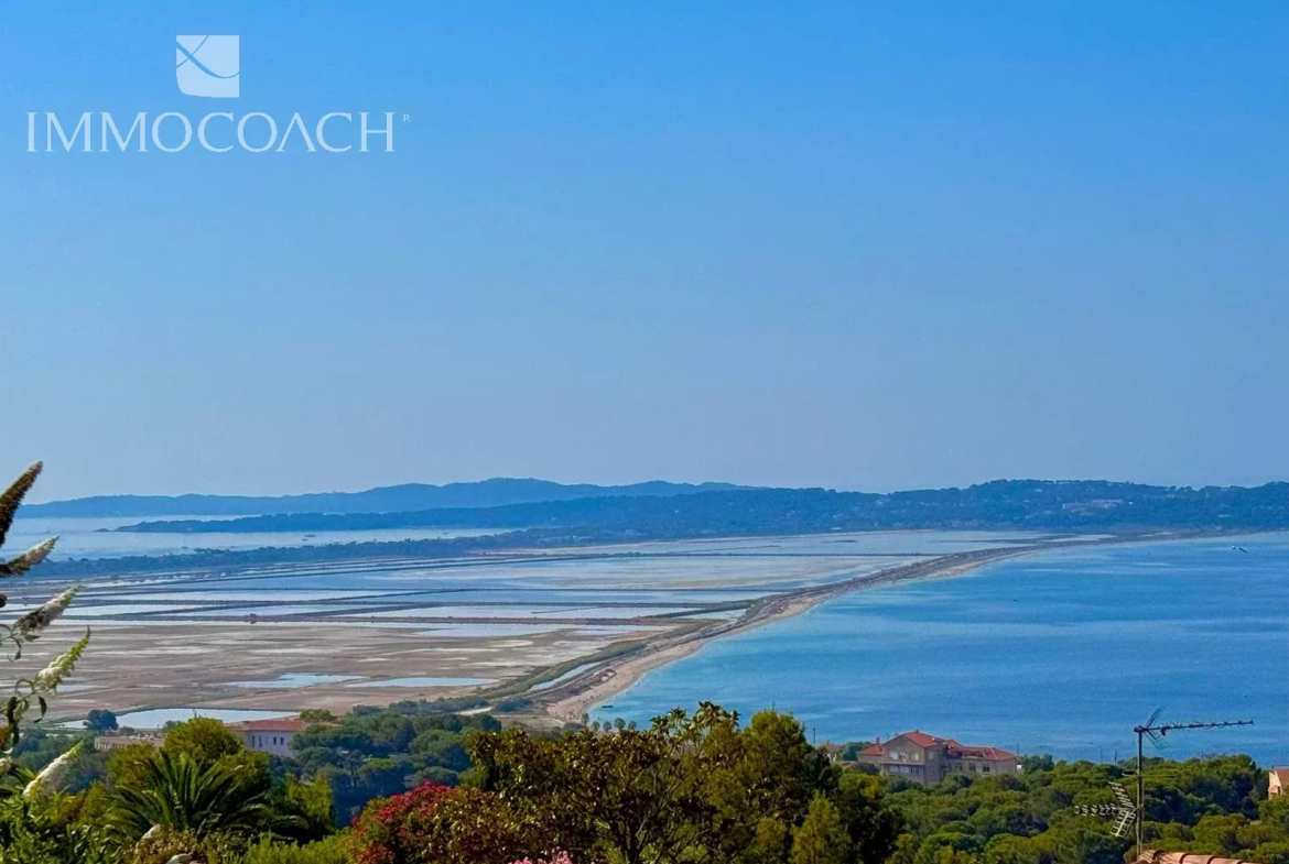 Cette villa de 196 M², entièrement rénovée, offre un vaste séjour avec cuisine américaine prolongé par une terrasse à la vue imprenable sur Giens et Porquerolles.