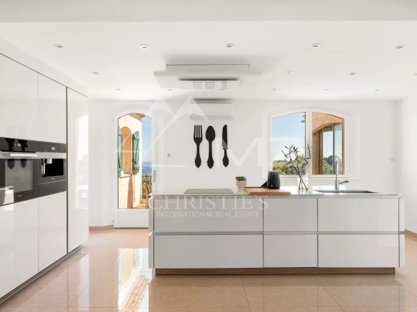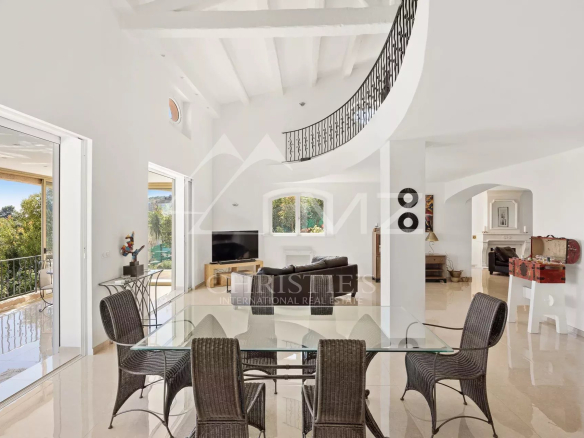 Cette jolie villa de près de 300 m2, entièrement rénovée, dotée d’une belle vue mer sur le Cap d’Antibes, est située en position dominante, dans un quartier très calme proche de tout.