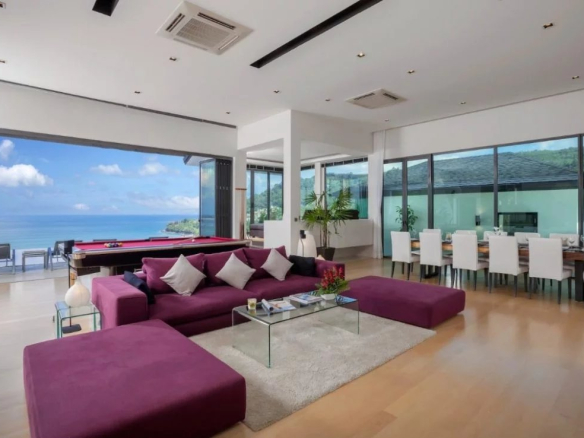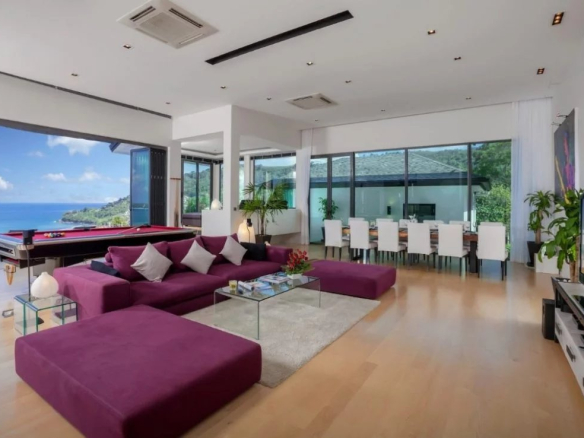 Le salon central avec système de fenêtre Sun Paradise rétractable du sol au plafond et dispose d’une table de billard de calibre championnat Pro de 9 pieds. Un grand canapé confortable fait face à la grande télévision à écran plat fixée au mur et une table à manger en bois d’acacia massif de 3,6 m de long pour 14 personnes se trouve d’un côté.