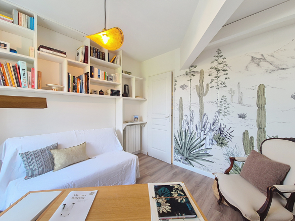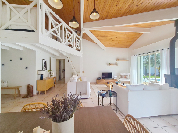 Espace Cocooning : Une mezzanine mansardée surplombant le séjour, idéale pour un bureau, une bibliothèque ou un coin TV.
