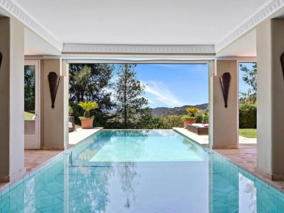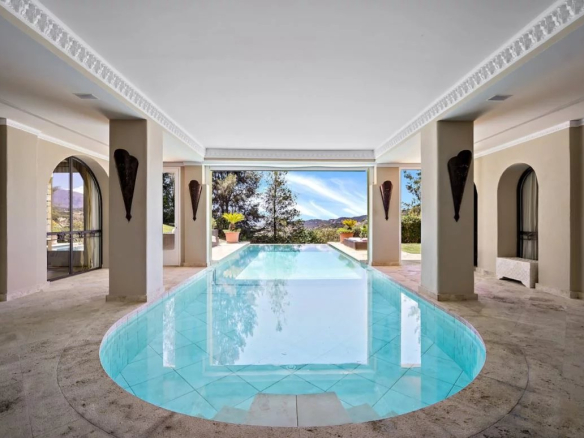 Le niveau inférieur de cette luxueuse villa est dédié au divertissement et à la détente. Faites-vous plaisir dans la grande piscine à débordement chauffée intérieure-extérieure, entourée de luxueux marbre travertin, ou utilisez la salle de sport, la salle de cinéma et la salle de jeux.
