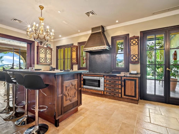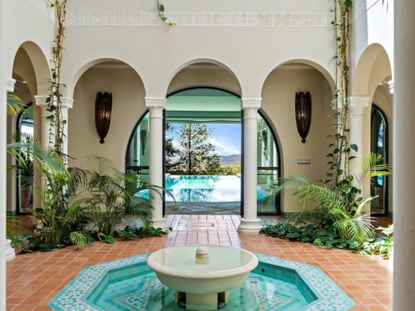 Lorsque vous entrez dans la vaste allée pavée, la magnificence de la Casa Morisca se déroule sous vos yeux. Le hall d’entrée principal vous mène dans un atrium captivant de style mauresque, orné d’arcs en plâtre fabriqués à la main par l’Alhambra et donnant sur une fascinante fontaine de sous-sol. Le toit en verre coulissant automatisé de l’atrium crée une expérience intérieure-extérieure homogène, invitant une brise fraîche et la lumière naturelle à embellir la piscine chauffée intérieure-extérieure.