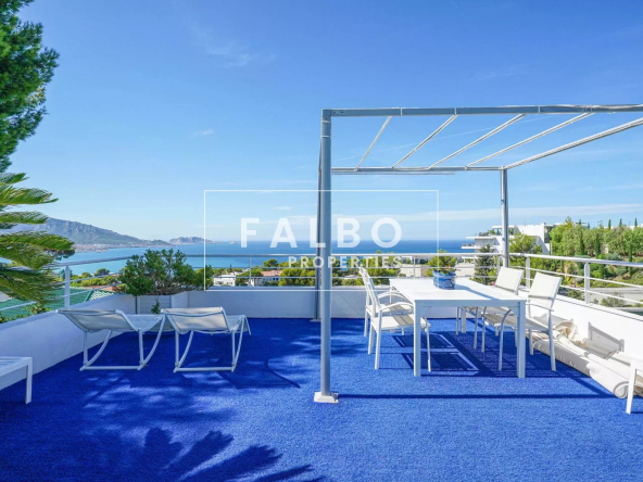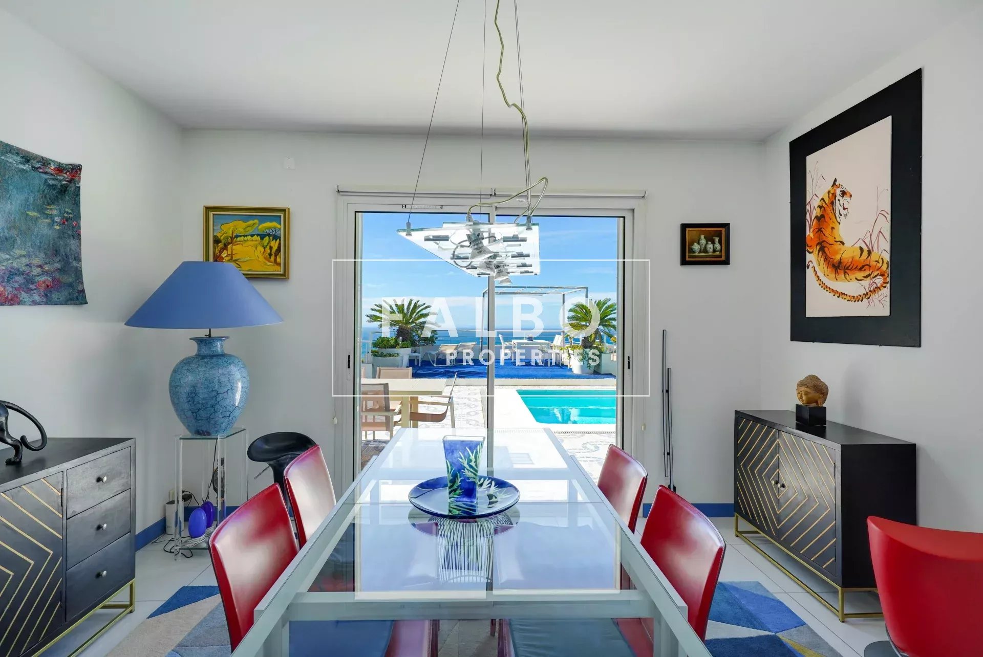 D’une superficie habitable d’environ 235m², elle offre au rez-de-chaussée un vaste séjour, salle à manger, cuisine séparée avec cellier le tout ouvert sur une magnifique terrasse avec piscine et vue mer. Un ascenseur vitré privatif arrive directement sur la terrasse depuis le bas de la maison.