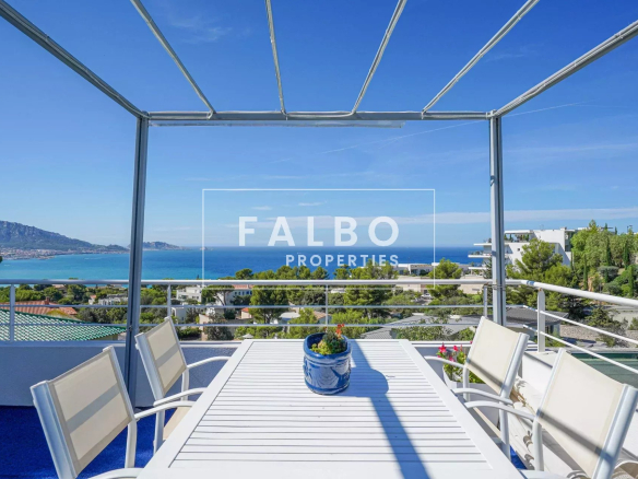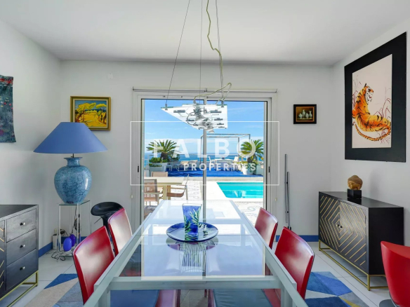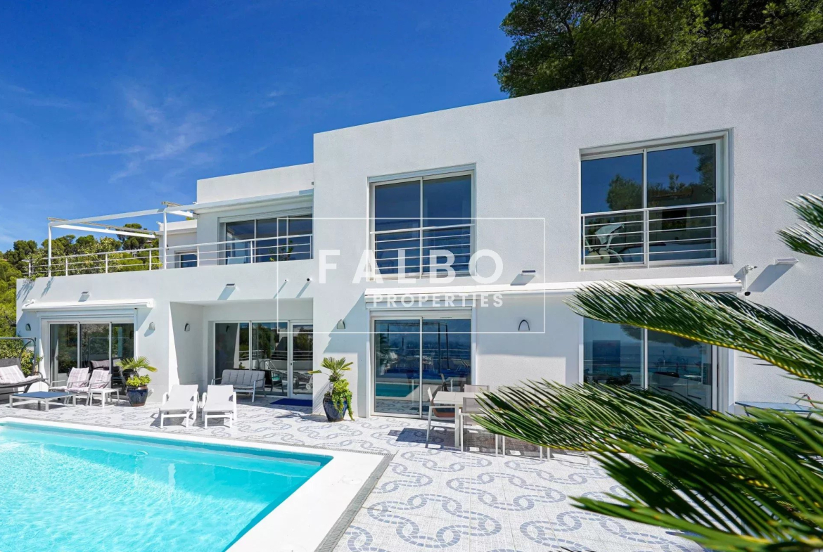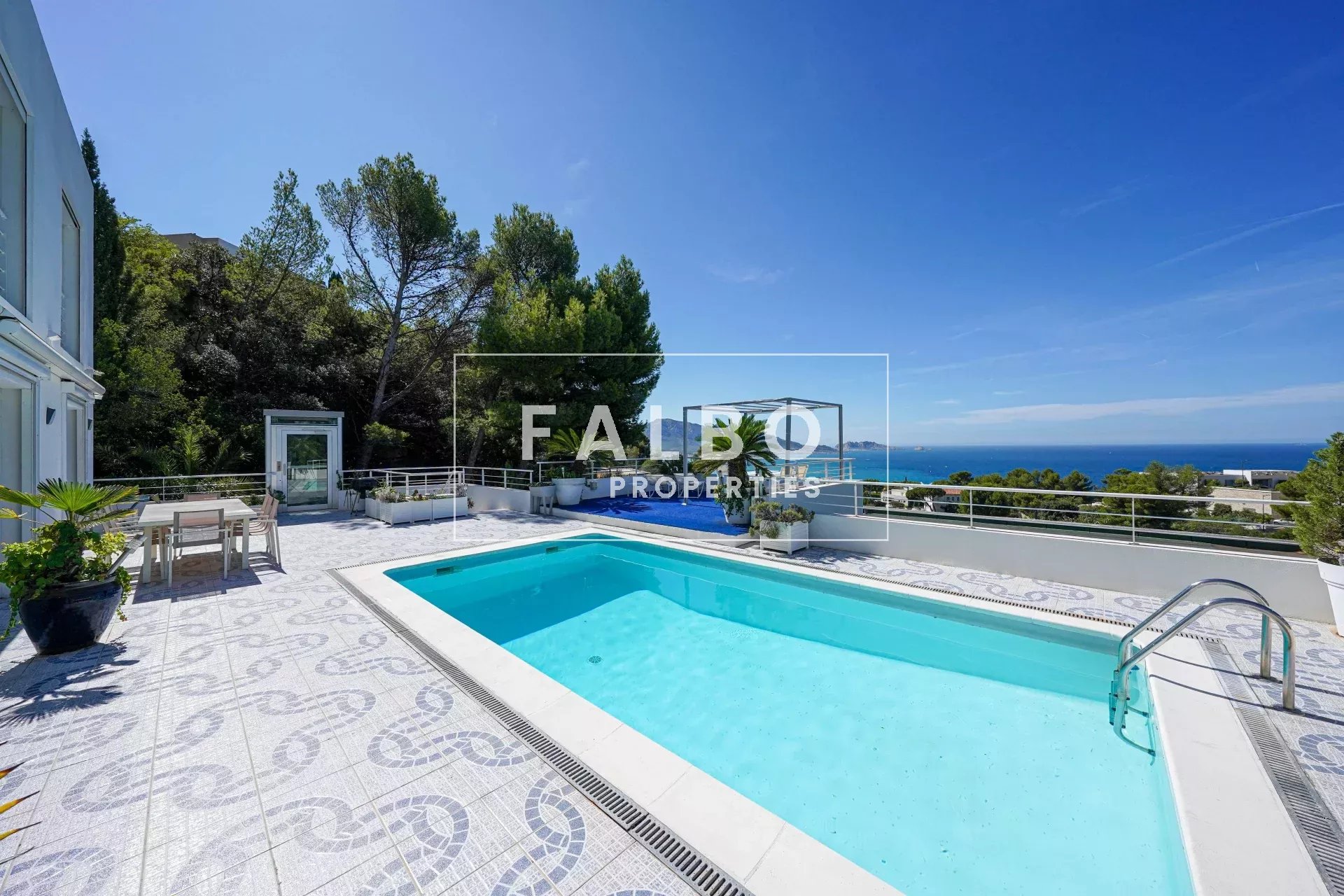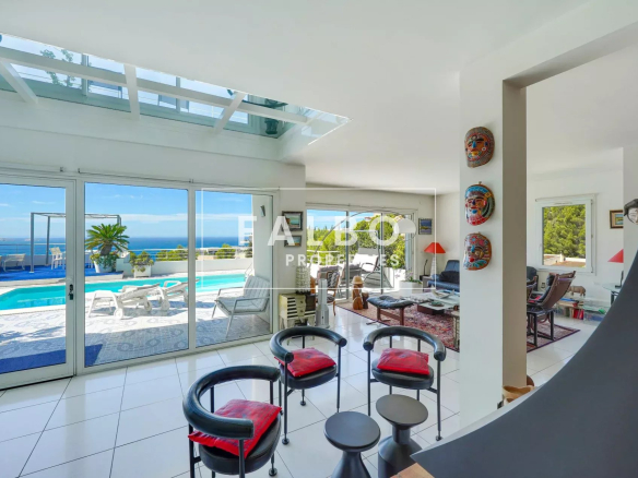 Le rez-de-chaussée propose un vaste séjour avec salle à manger et cuisine indépendante, ouverts sur une grande terrasse avec piscine et vue mer. Un ascenseur vitré privatif permet d’accéder directement à la maison.