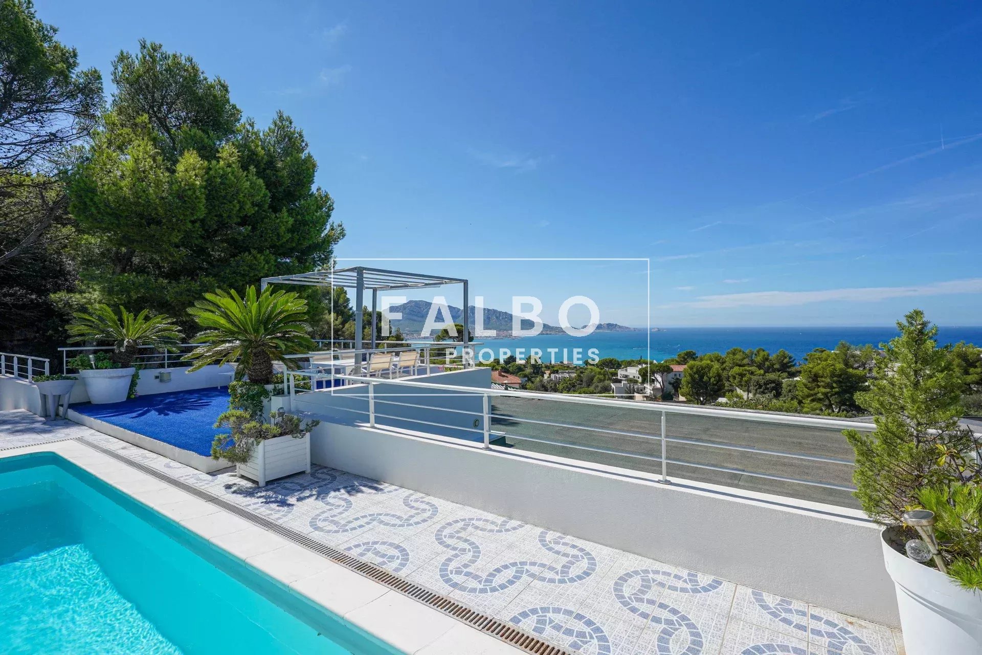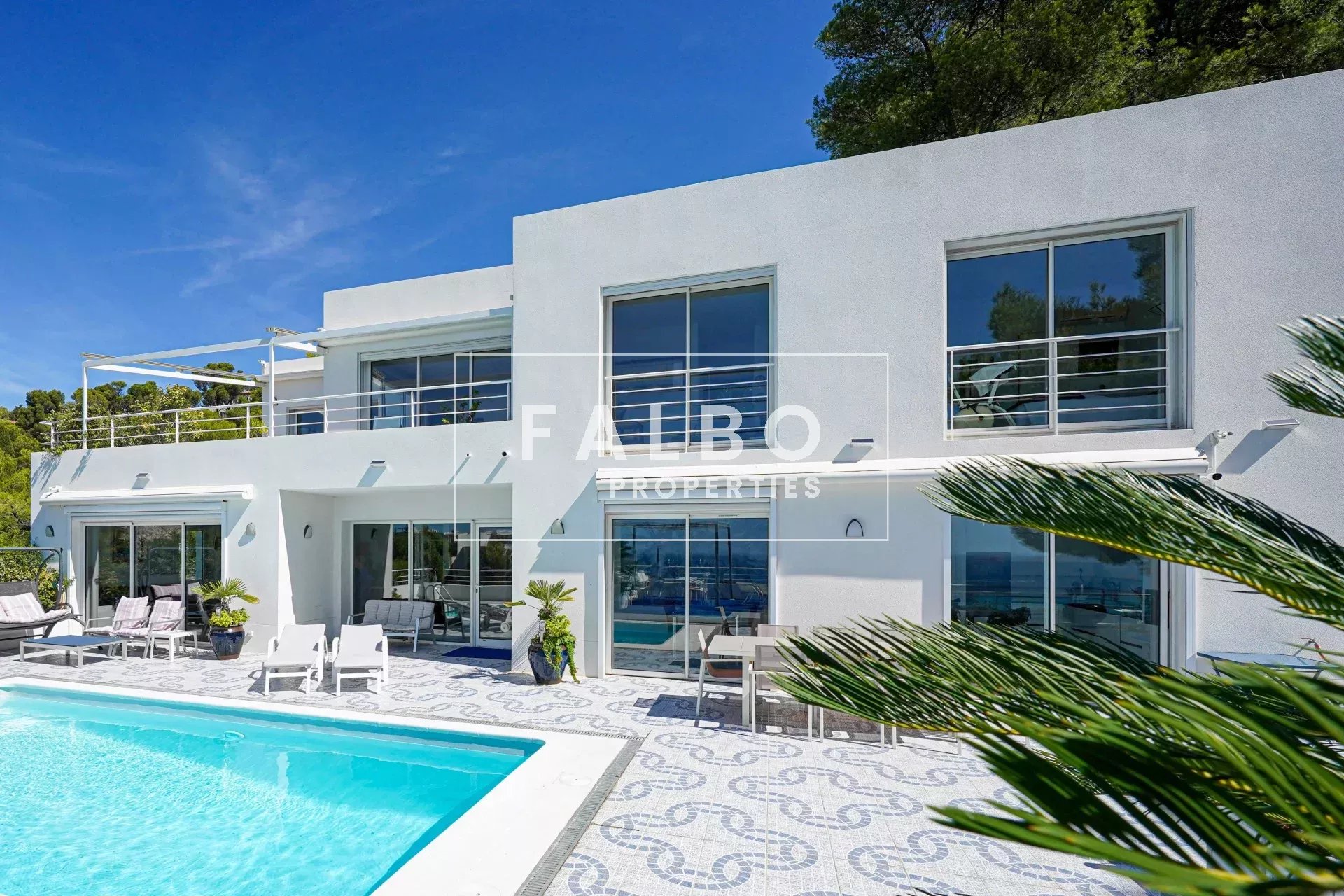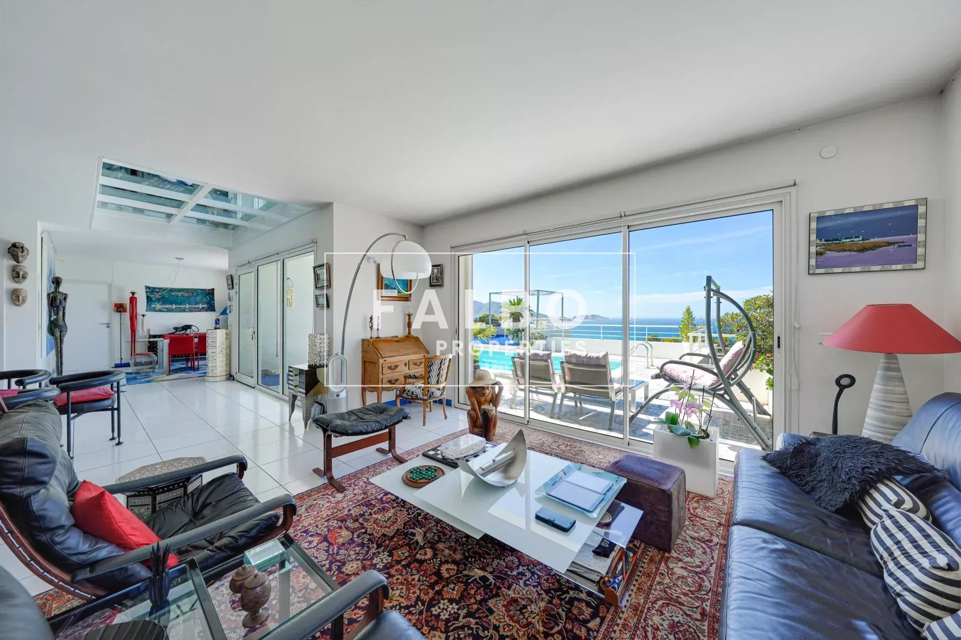 Le rez-de-chaussée propose un vaste séjour avec salle à manger et cuisine indépendante, ouverts sur une grande terrasse avec piscine et vue mer. Un ascenseur vitré privatif permet d’accéder directement à la maison.
