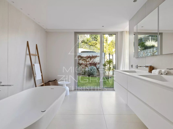 Au sein d’un petit domaine privé sécurisé dans un des meilleurs quartiers de Villefranche, cette magnifique propriété neuve d’environ 360 m2 a été conçue avec des prestations très haut de gamme, par un architecte renommé. De la propriété, on profite d’une vue imprenable sur la prestigieuse presqu’île de Saint Jean Cap Ferrat et la baie de Villefranche. La villa desservie par un ascenseur, offre un intérieur chic, luxueux et moderne avec un vaste espace de réception, une large cuisine moderne. La chambre de maître avec terrasse, salle de bain en suite et dressing occupe tout un étage et dispose également d’un vaste salon. Quatre autres chambres, toutes avec dressing et salle de bain en suite se trouvent au niveau du jardin. Un vaste appartement de 2 pièces complète l’ensemble. Toutes les pièces bénéficient d’une luminosité exceptionnelle en s’ouvrant sur l’espace extérieur ensoleillé et la piscine. Terrain arboré avec agrumes et pelouse. Garage double avec ascenseur pour voiture. Possibilité d’aménager une salle de sport ou de cinéma.