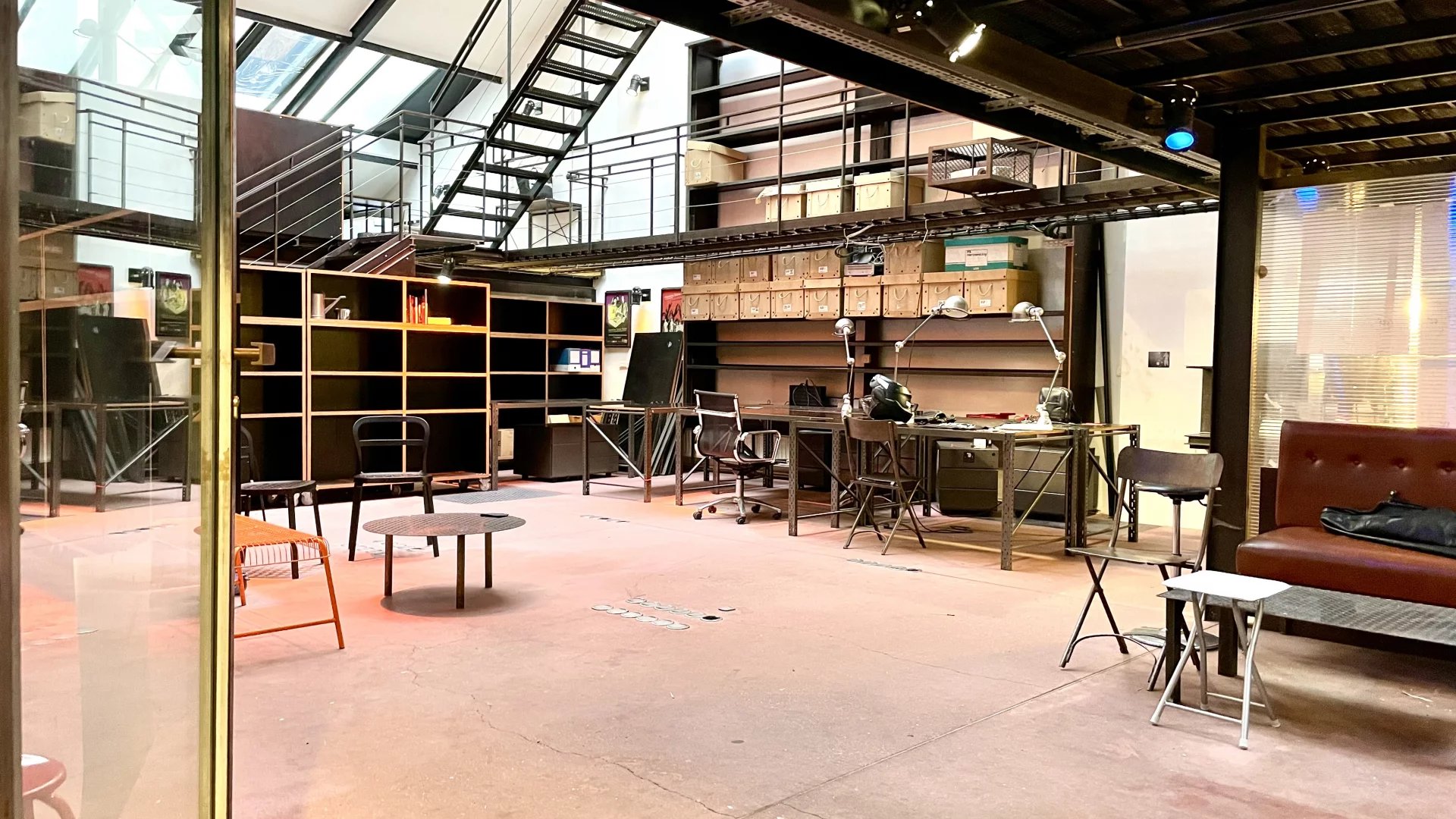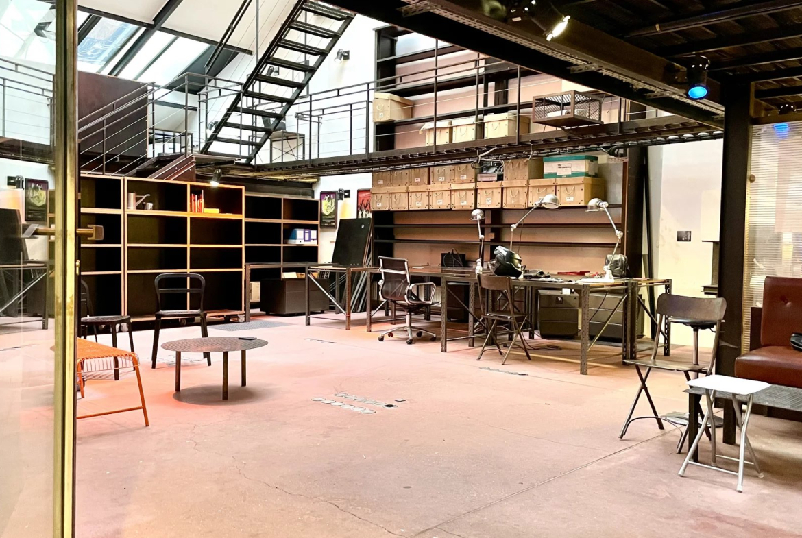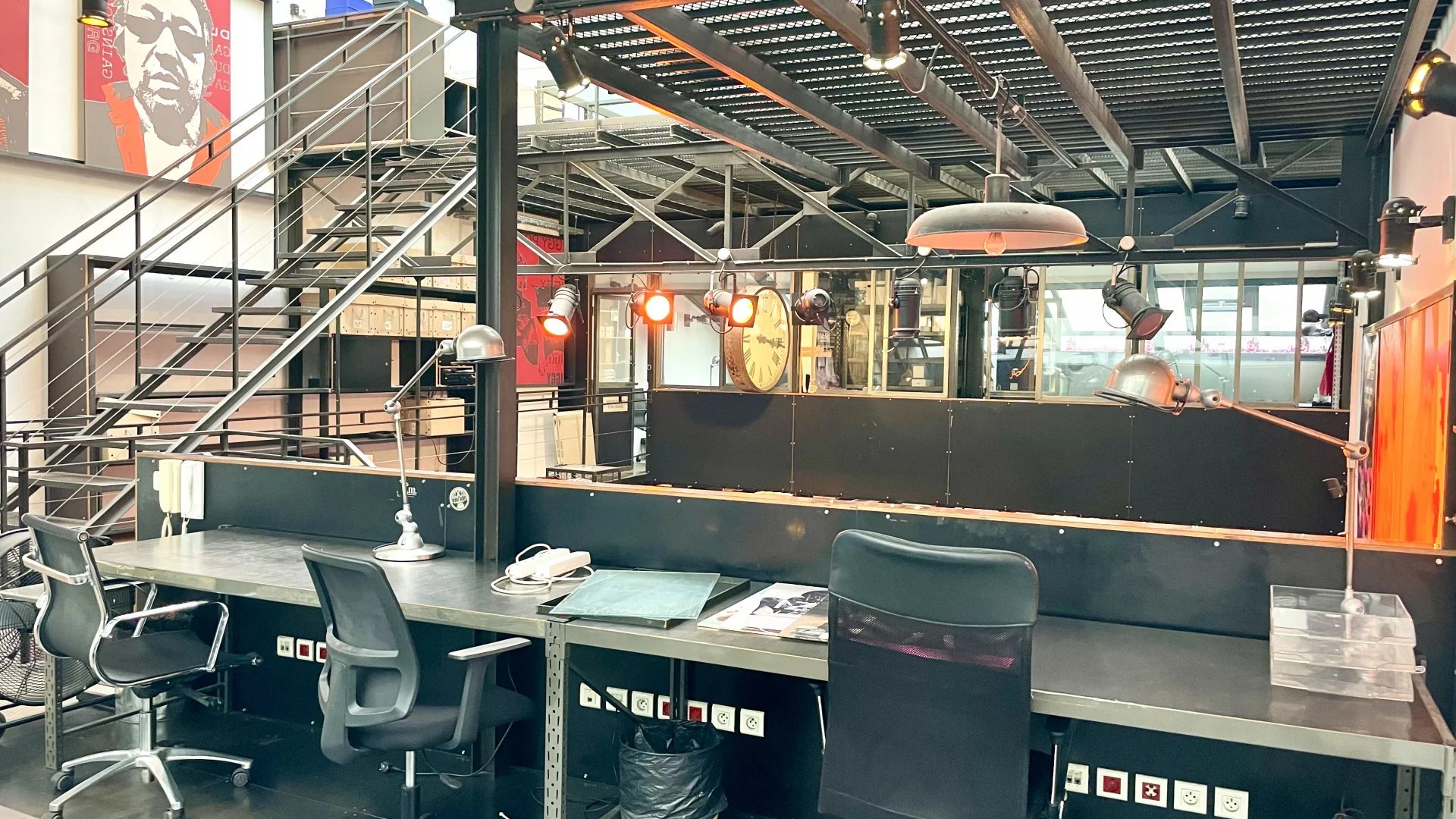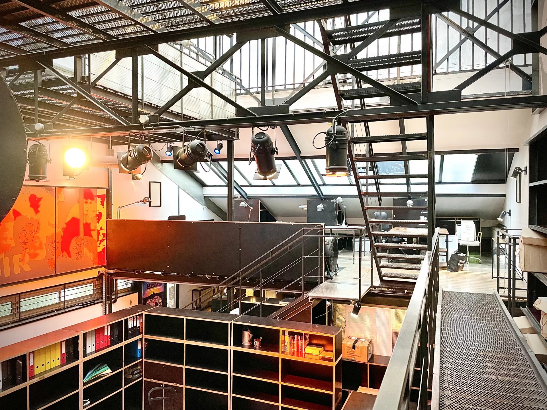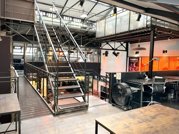 Un escalier tout en acier dessert 2 mezzanines se faisant face reliées par une passerelle, un autre escalier distribue la 2 eme mezzanine idéal pour une belle salle de réunion.