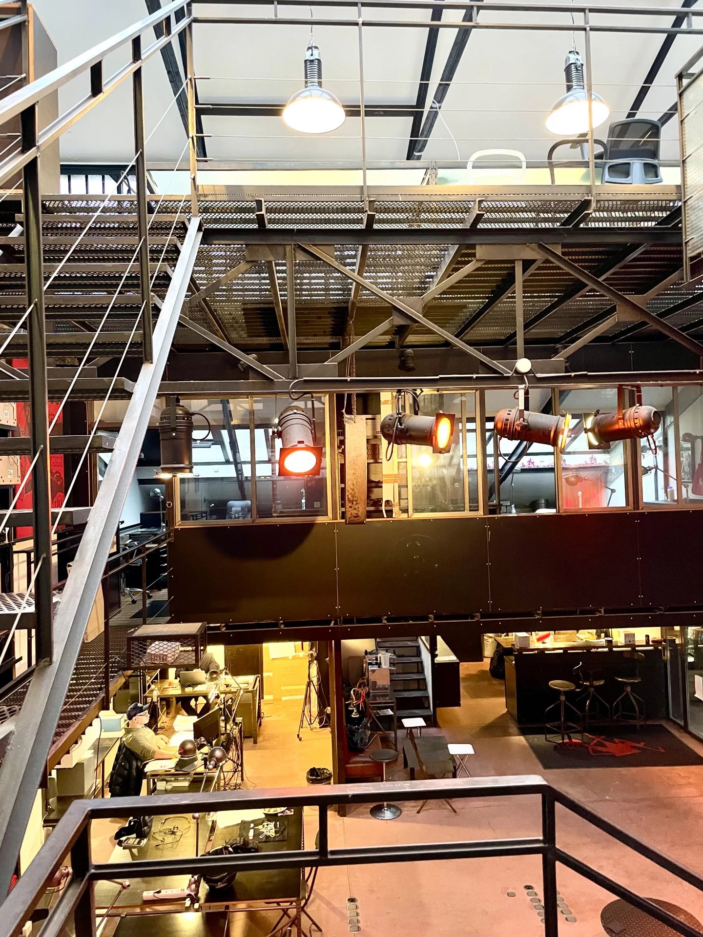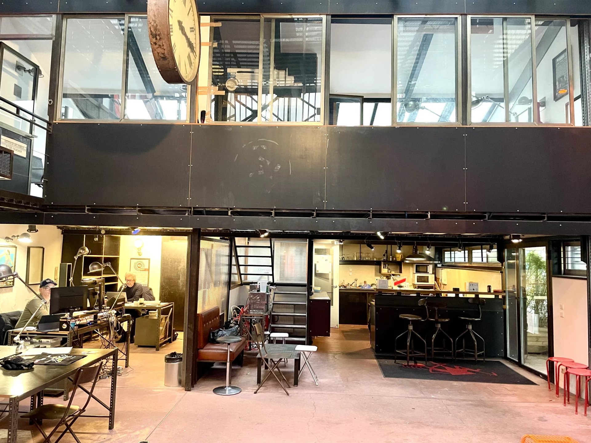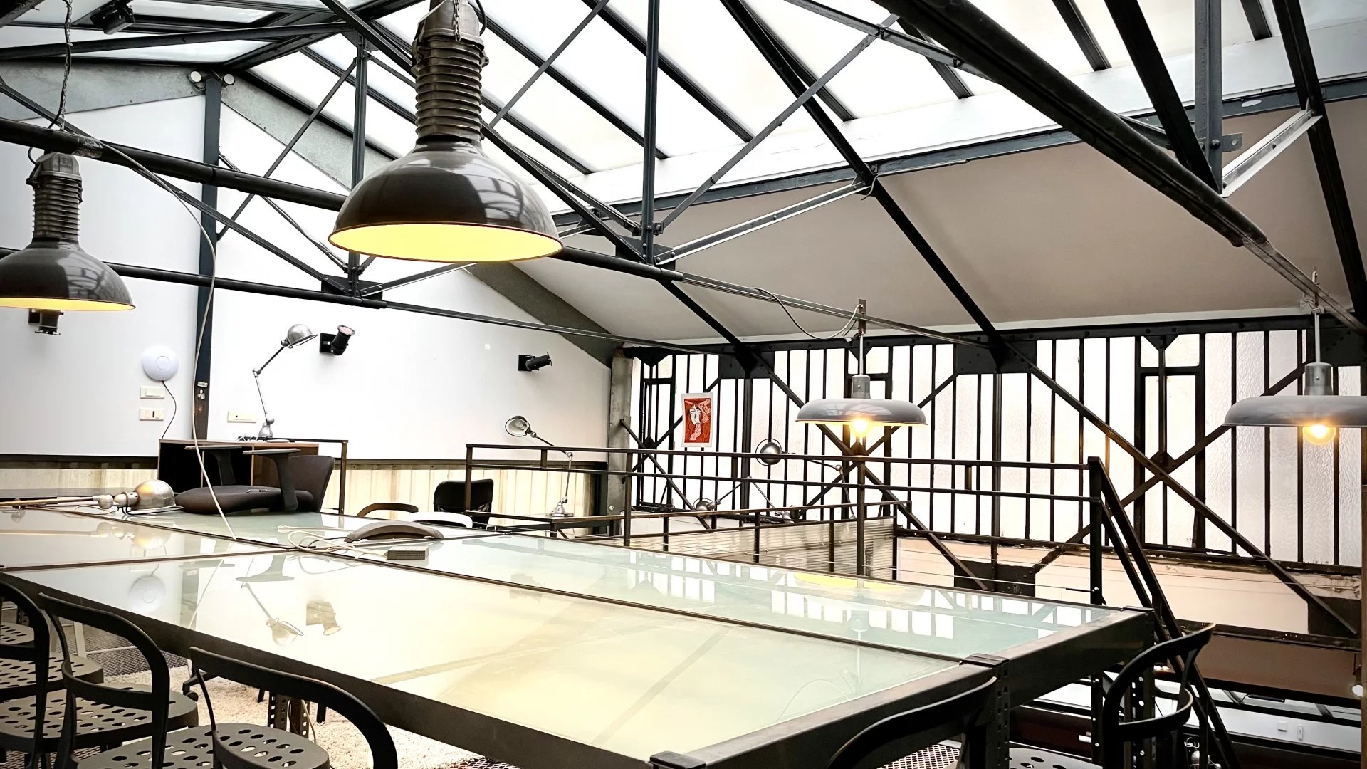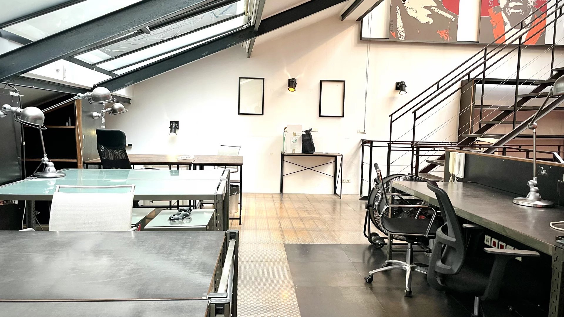 Un escalier tout en acier dessert 2 mezzanines se faisant face reliées par une passerelle, un autre escalier distribue la 2 eme mezzanine idéal pour une belle salle de réunion.