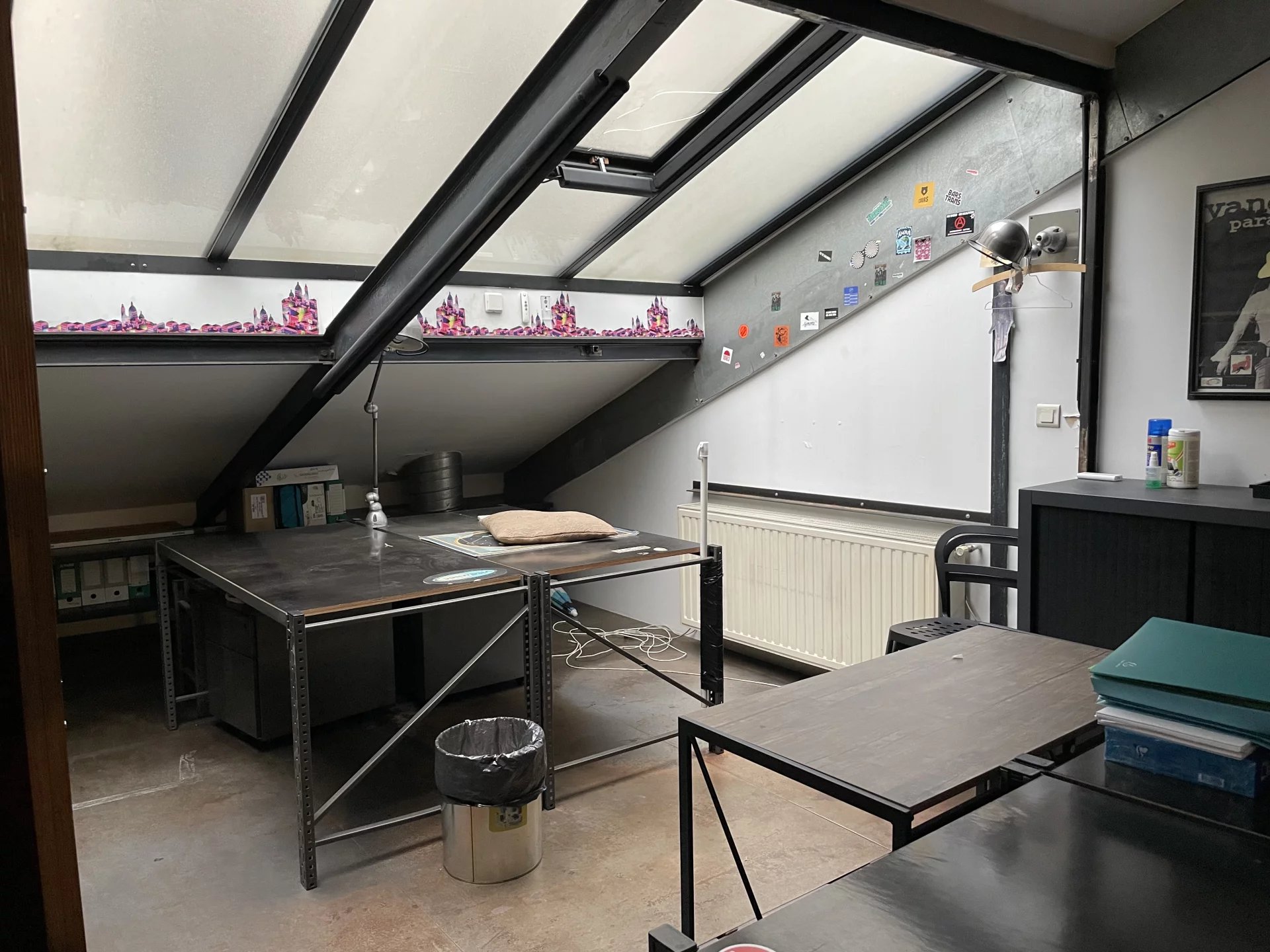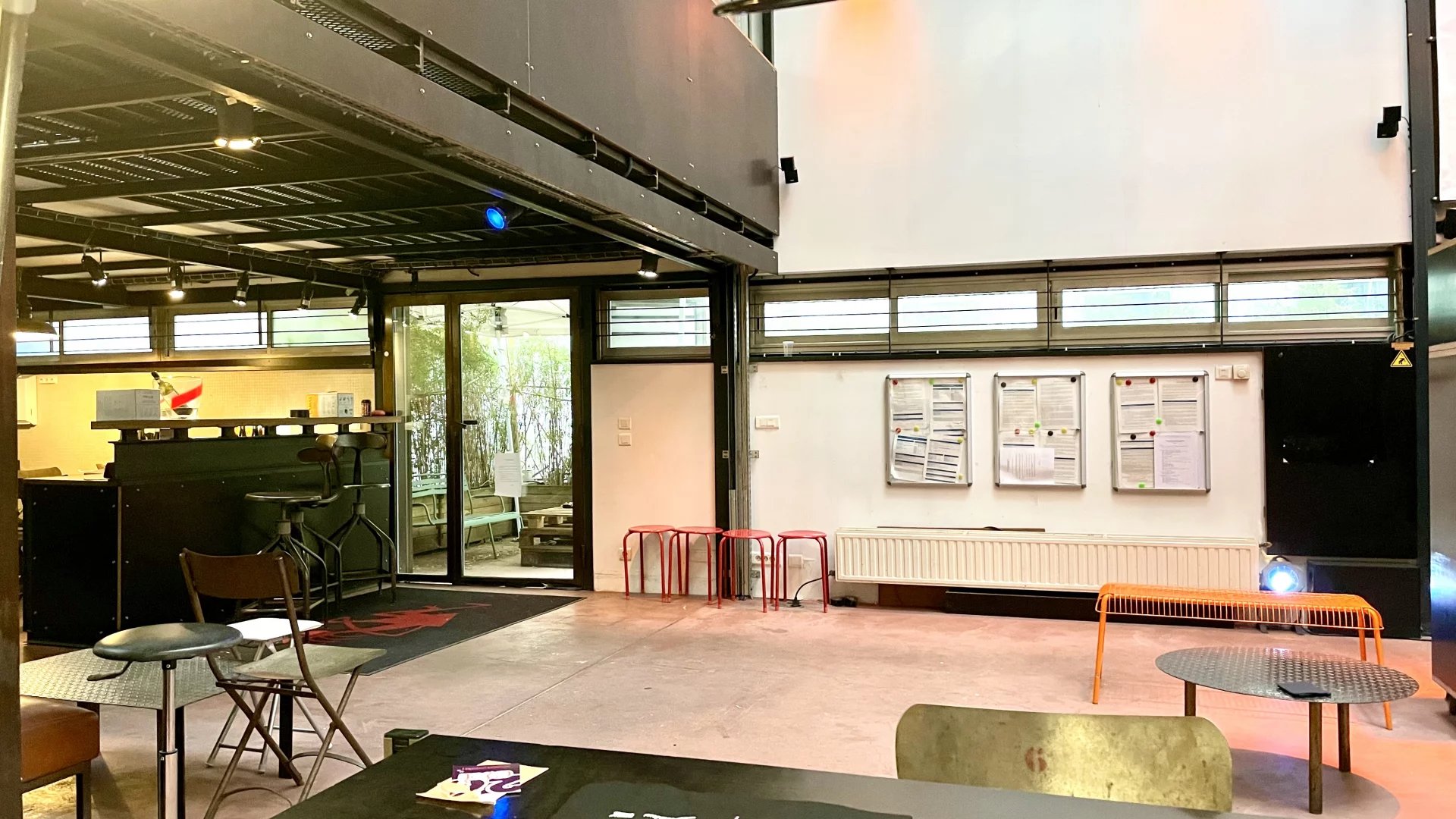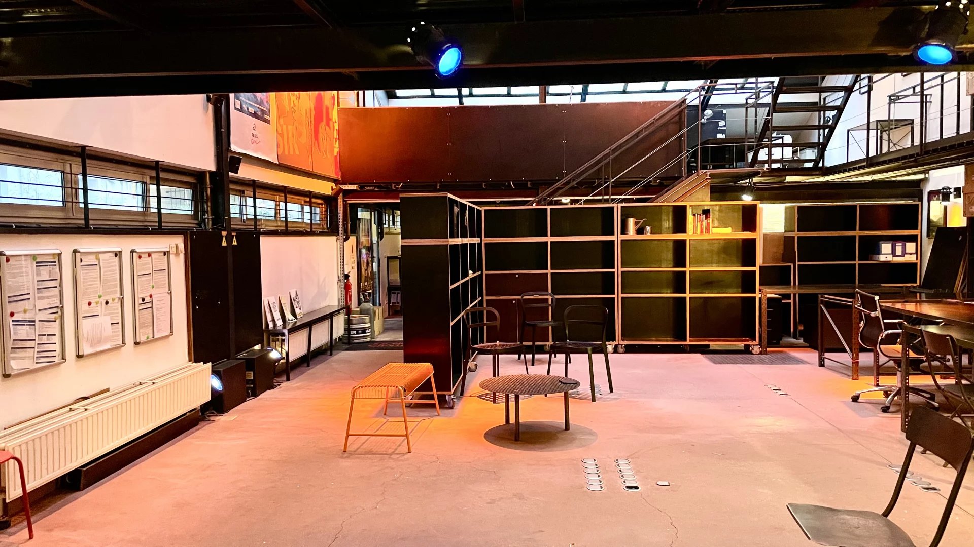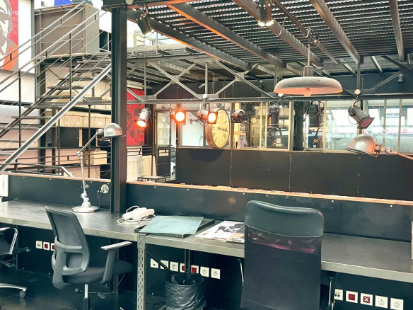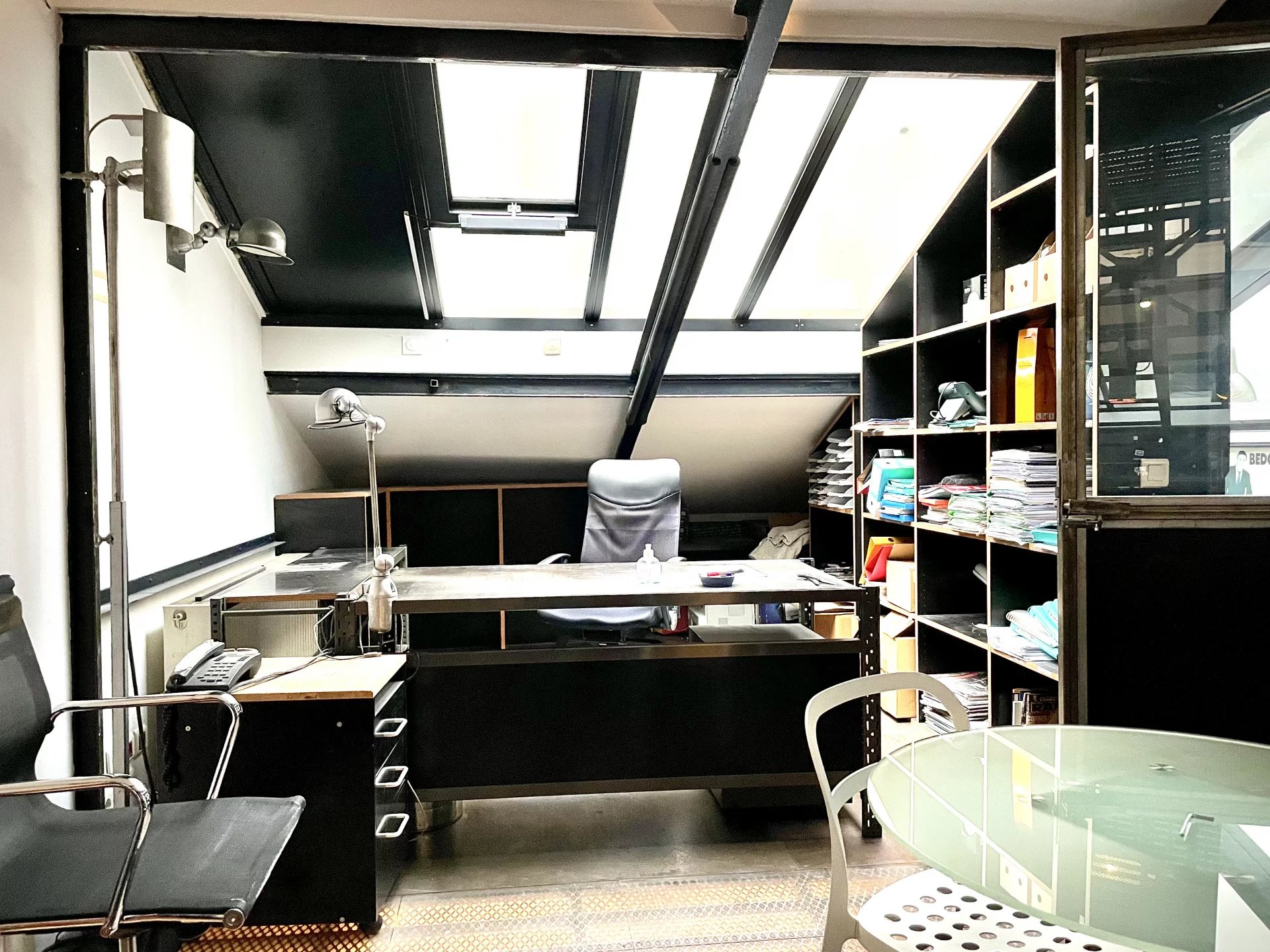 Un escalier tout en acier dessert 2 mezzanines se faisant face reliées par une passerelle, un autre escalier distribue la 2 eme mezzanine idéal pour une belle salle de réunion.