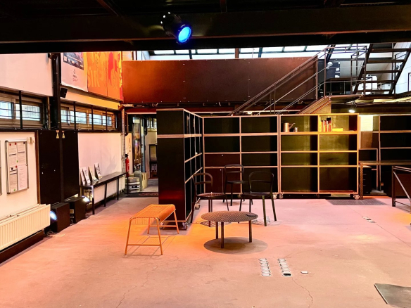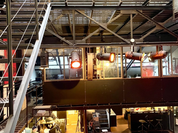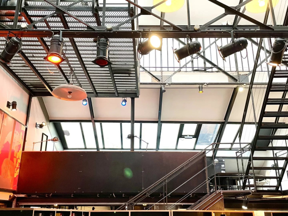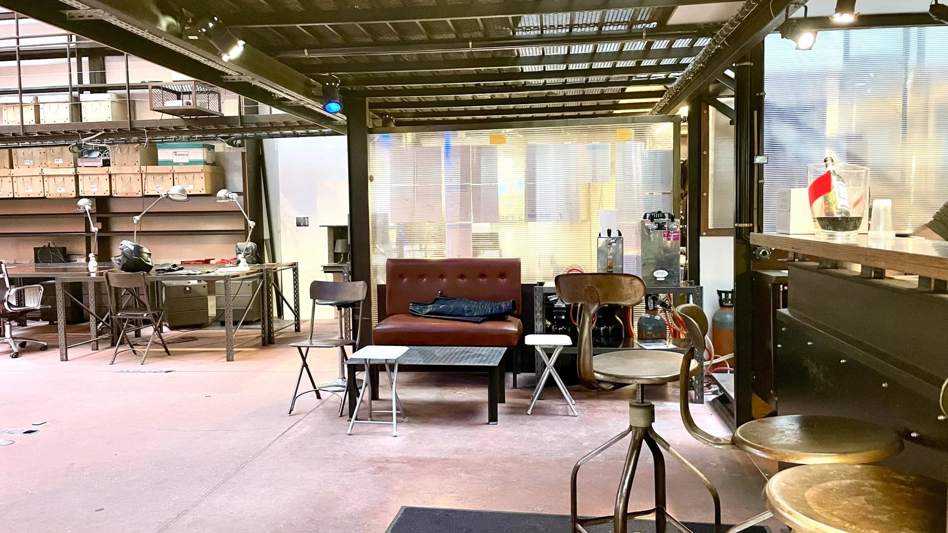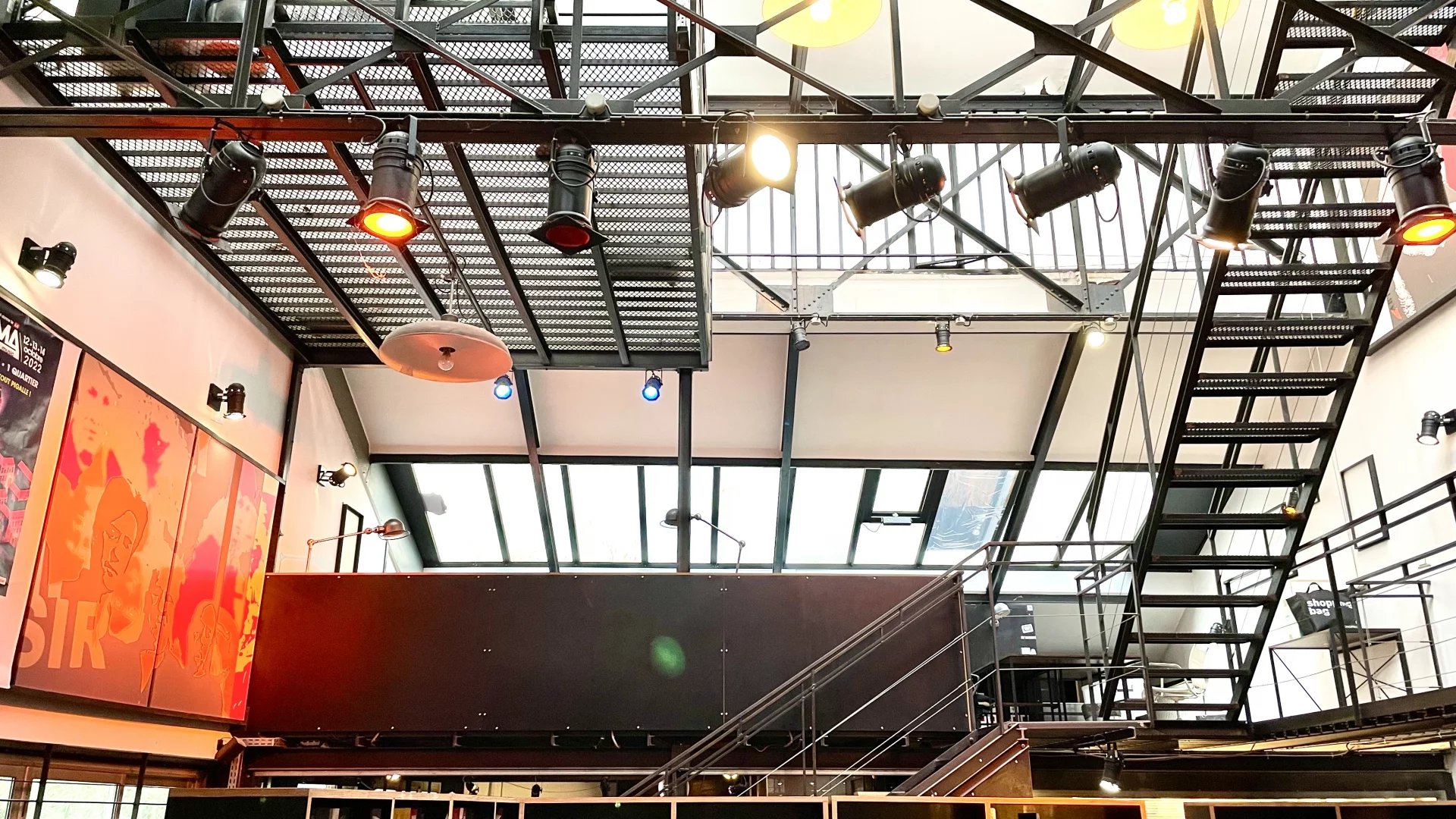 Murs en béton, ossature métallique, escaliers et passerelles industrielles, verrières zénithales.