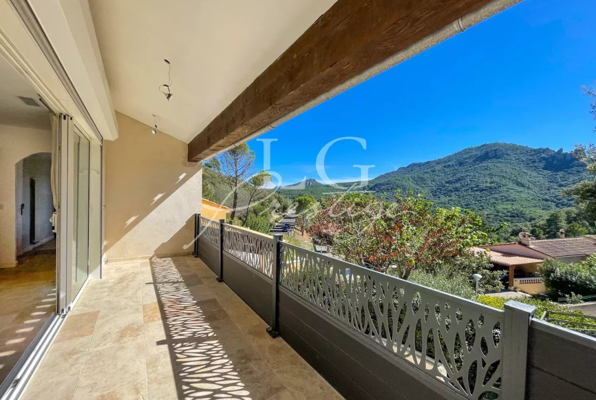 À 10 minutes de Mandelieu, maison jumelée rénovée de 180 m² aux beaux volumes, en pleine nature sur un terrain de 640 m² avec piscine, jacuzzi, cuisine d’été et garage, comprenant un grand séjour, une salle à manger sous véranda, une cuisine indépendante, trois chambres, deux salles de bains, deux WC et un studio indépendant.