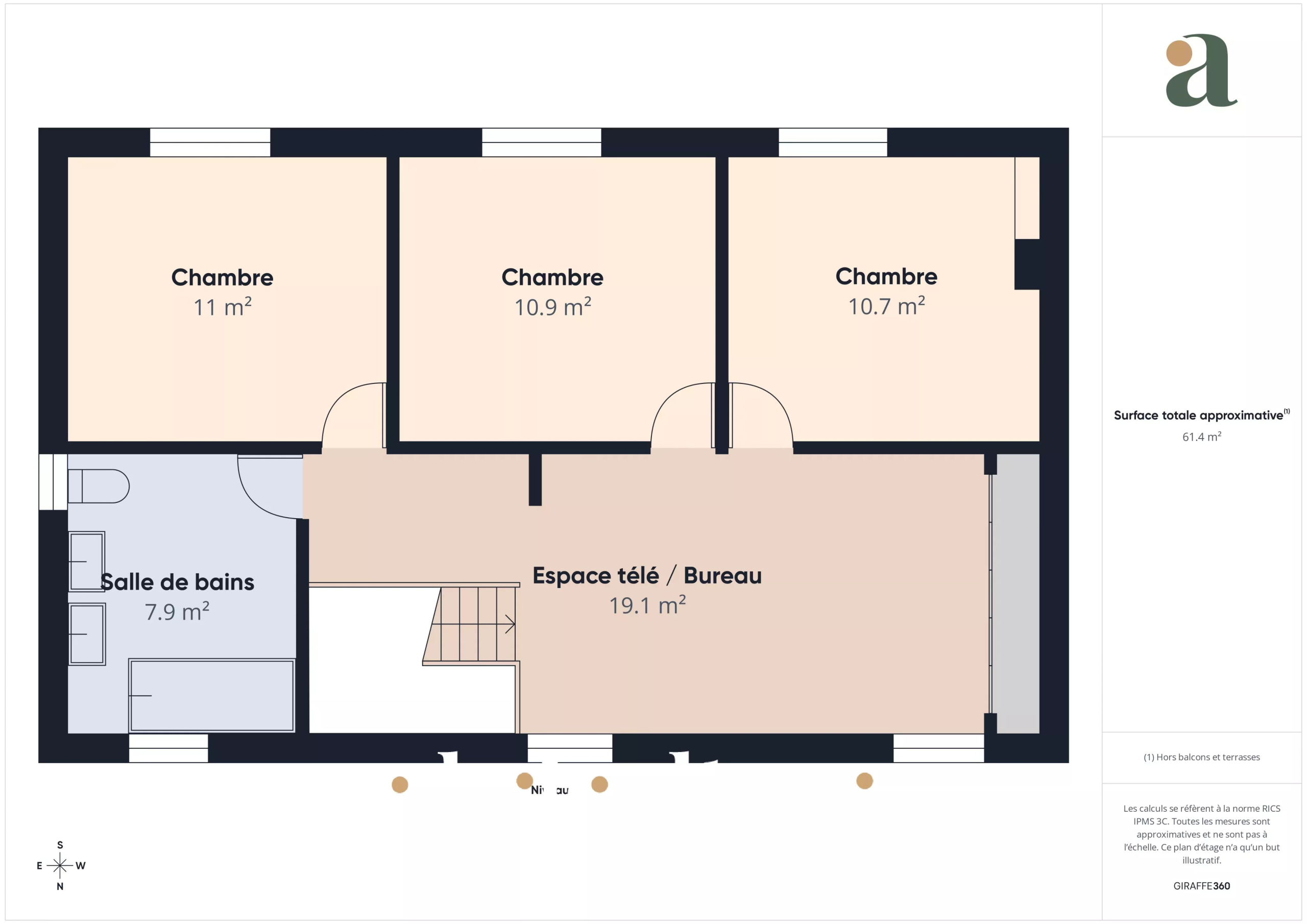 À l’étage, un vaste plateau polyvalent — idéal pour un bureau, une salle de jeux ou un salon TV et qui dessert trois chambres et une salle de bains.