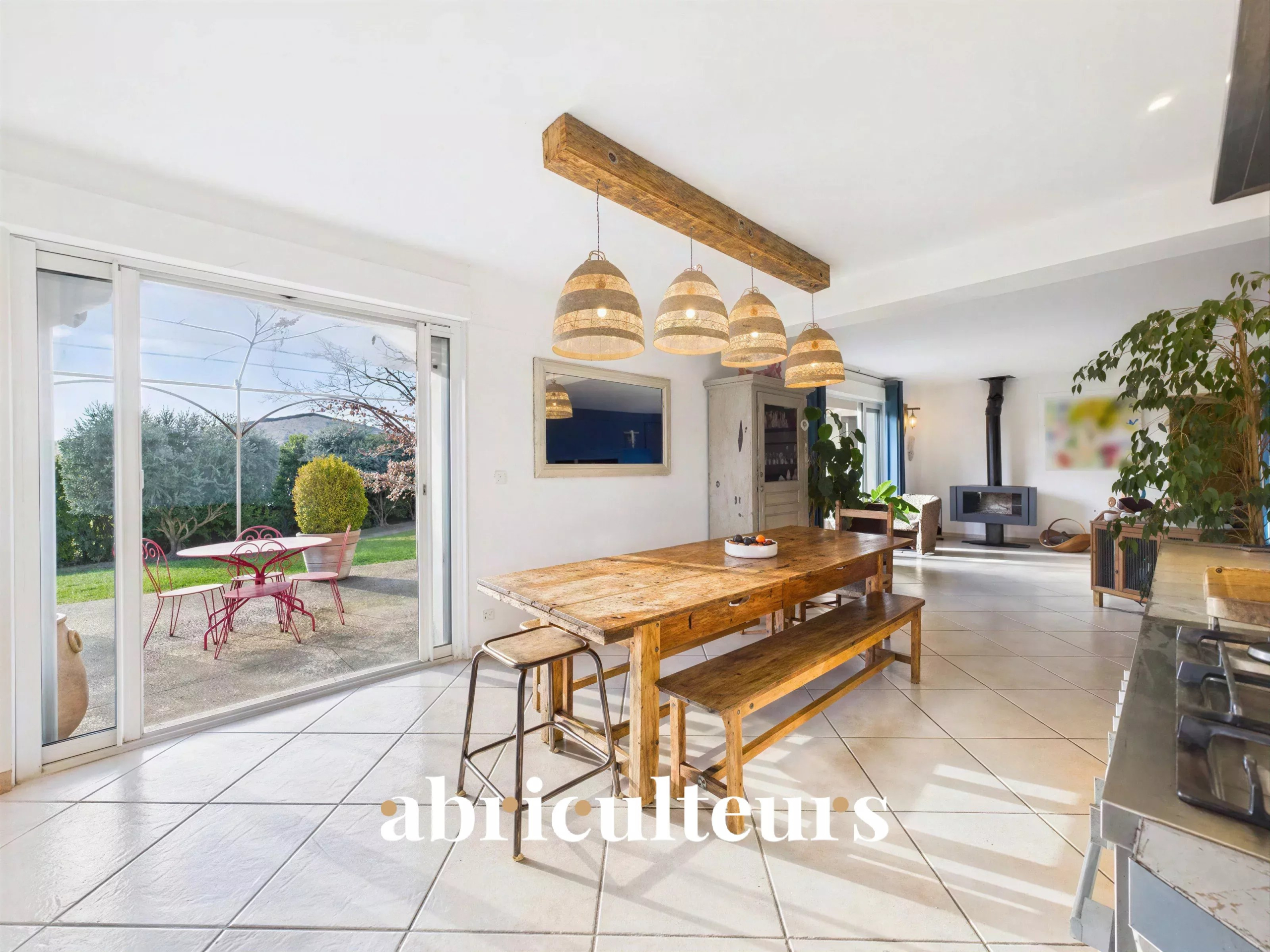 Un poêle à bois chaleureux anime cet espace d’échange qui communique harmonieusement avec le coin repas et la cuisine dînatoire.