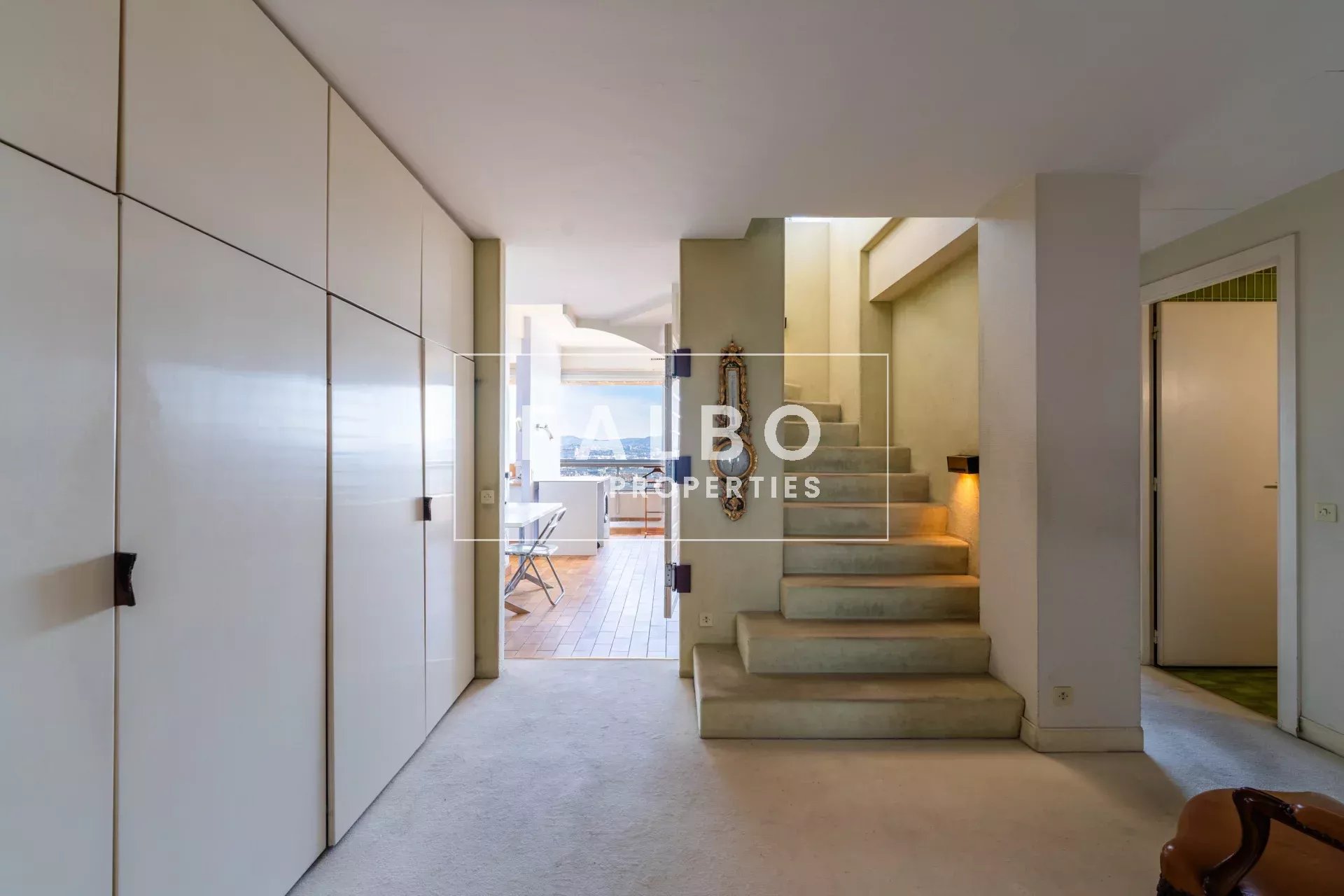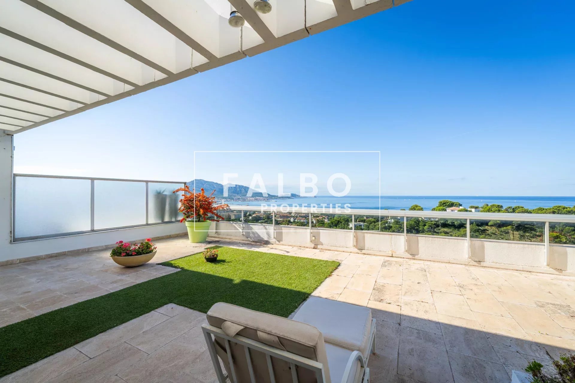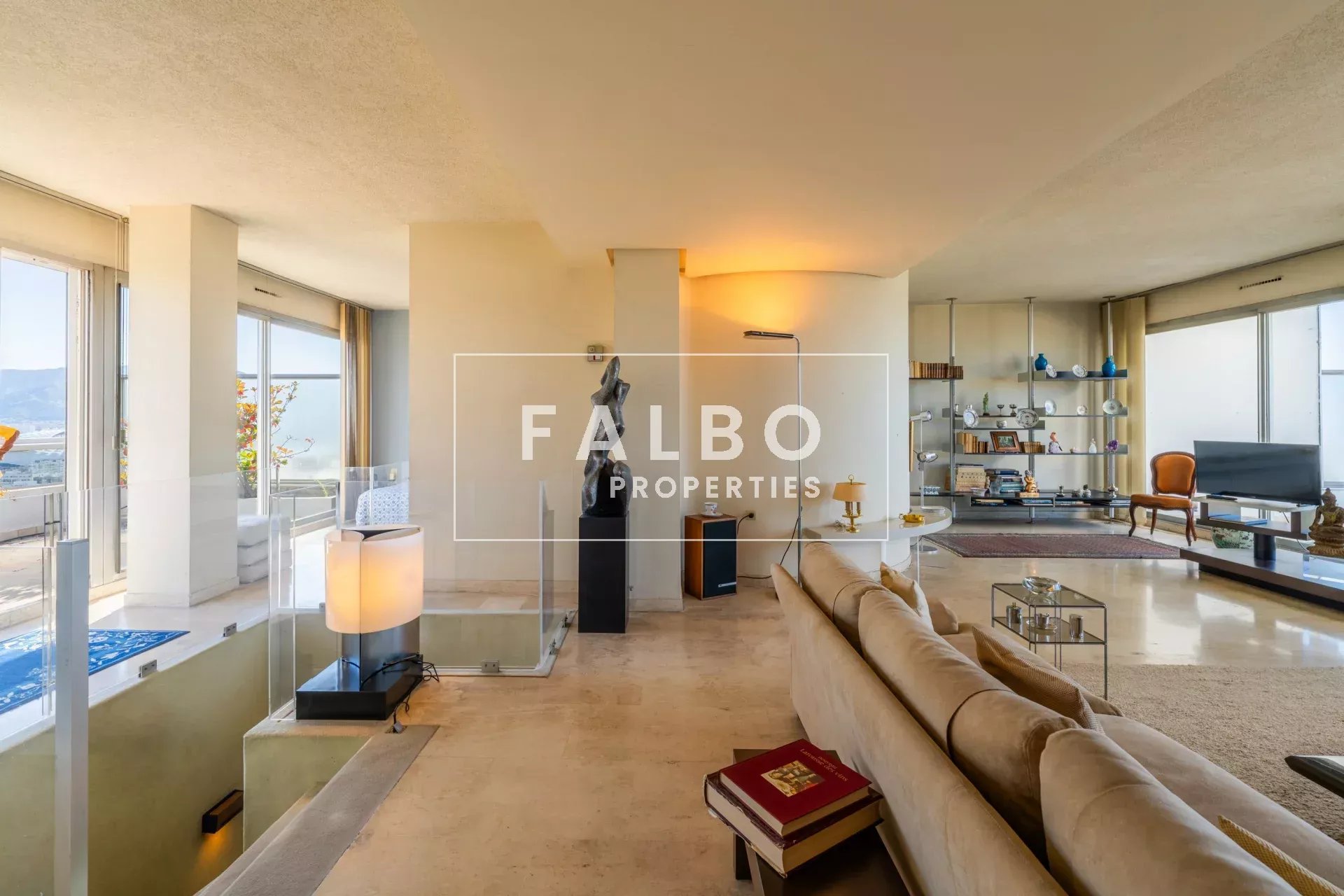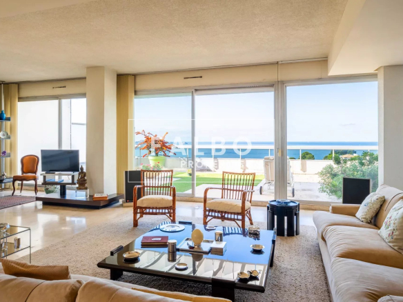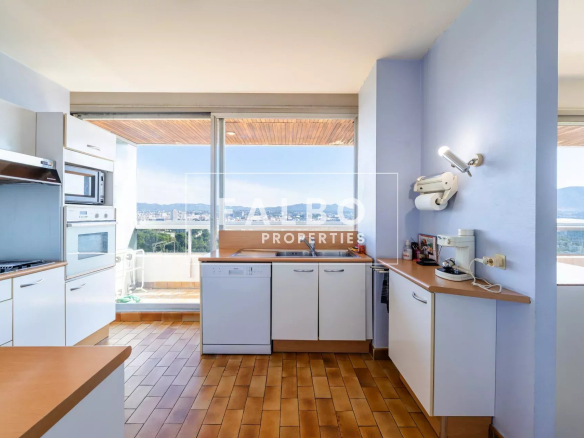 Composé de deux plateaux, entièrement traversant, sa superficie loi Carrez est de 215 m². L’étage principal se compose de deux suites avec leur salle de bain et d’une réception donnant sur une grande terrasse plein sud, une belle cuisine et son office. La partie supérieure comprend un salon de 50m² qui se prolonge sur un toit terrasse de 66m² avec un panorama spectaculaire, ainsi qu’une belle chambre et sa salle de bain et une cuisine d’été, le tout baigné d’une intense lumière. des terrasses à chaque étage côté ville et côté mer pour profiter pleinement de vues spectaculaires. Un box et une cave complètent ce bien.
