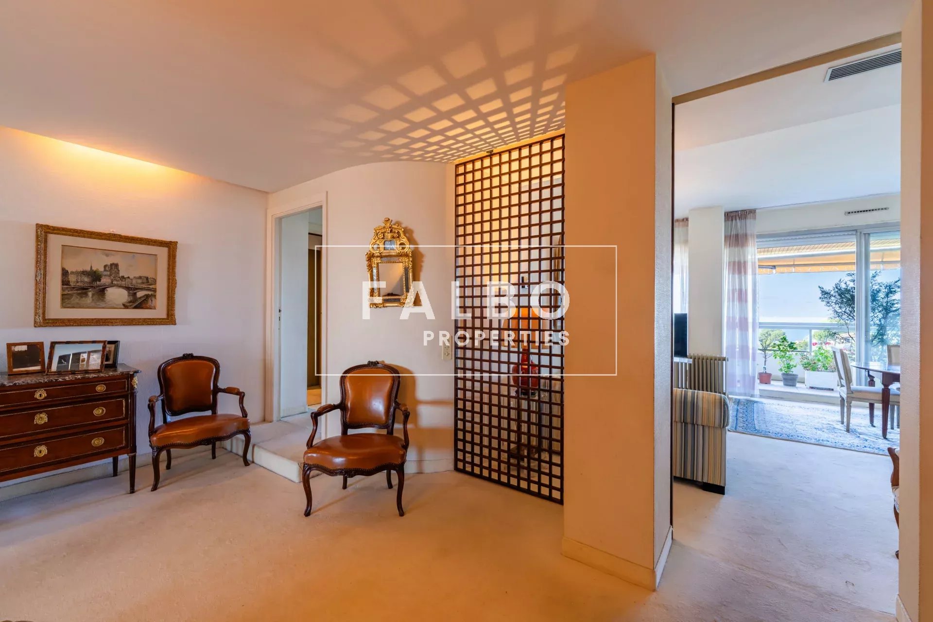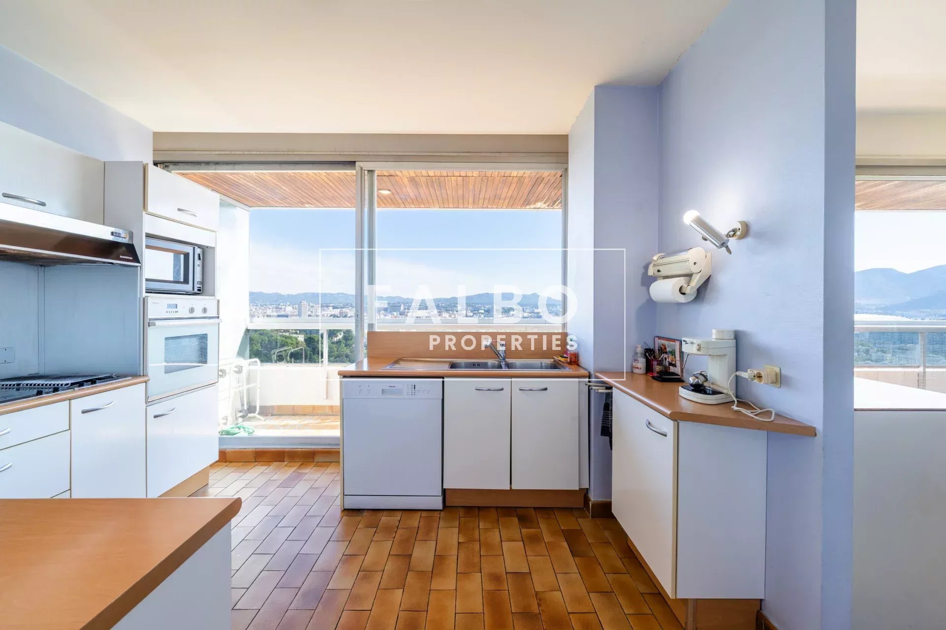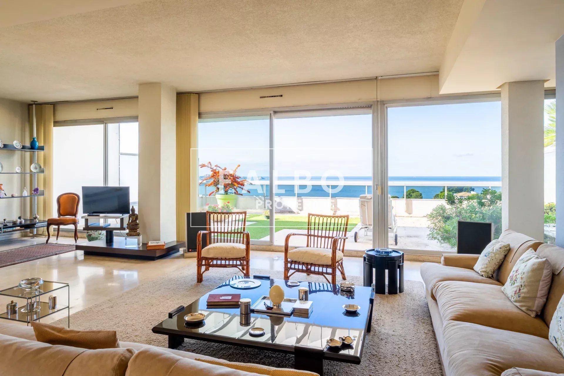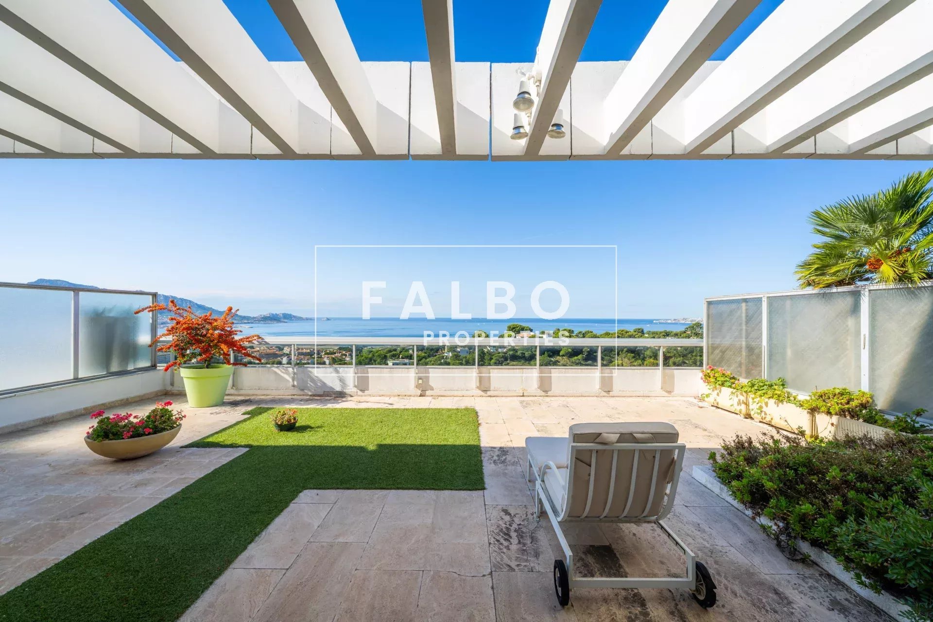 Composé de deux plateaux, entièrement traversant, sa superficie loi Carrez est de 215 m². L’étage principal se compose de deux suites avec leur salle de bain et d’une réception donnant sur une grande terrasse plein sud, une belle cuisine et son office. La partie supérieure comprend un salon de 50m² qui se prolonge sur un toit terrasse de 66m² avec un panorama spectaculaire, ainsi qu’une belle chambre et sa salle de bain et une cuisine d’été, le tout baigné d’une intense lumière. des terrasses à chaque étage côté ville et côté mer pour profiter pleinement de vues spectaculaires. Un box et une cave complètent ce bien.