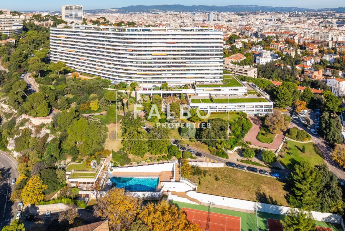 Superbe appartement au dernier étage d’une résidence de prestige sécurisée avec vue mer panoramique et grand toit-terrasse. Situé à proximité des plages et de la Corniche, proche des commerces du carré d’or du 8e, ce bien peu commun est parmi les habitations les plus exceptionnelles à Marseille par son emplacement, sa vue, et l’environnement au coeur d’une magnifique végétation méditerranéenne avec tennis, piscine et restaurant-poolhouse.