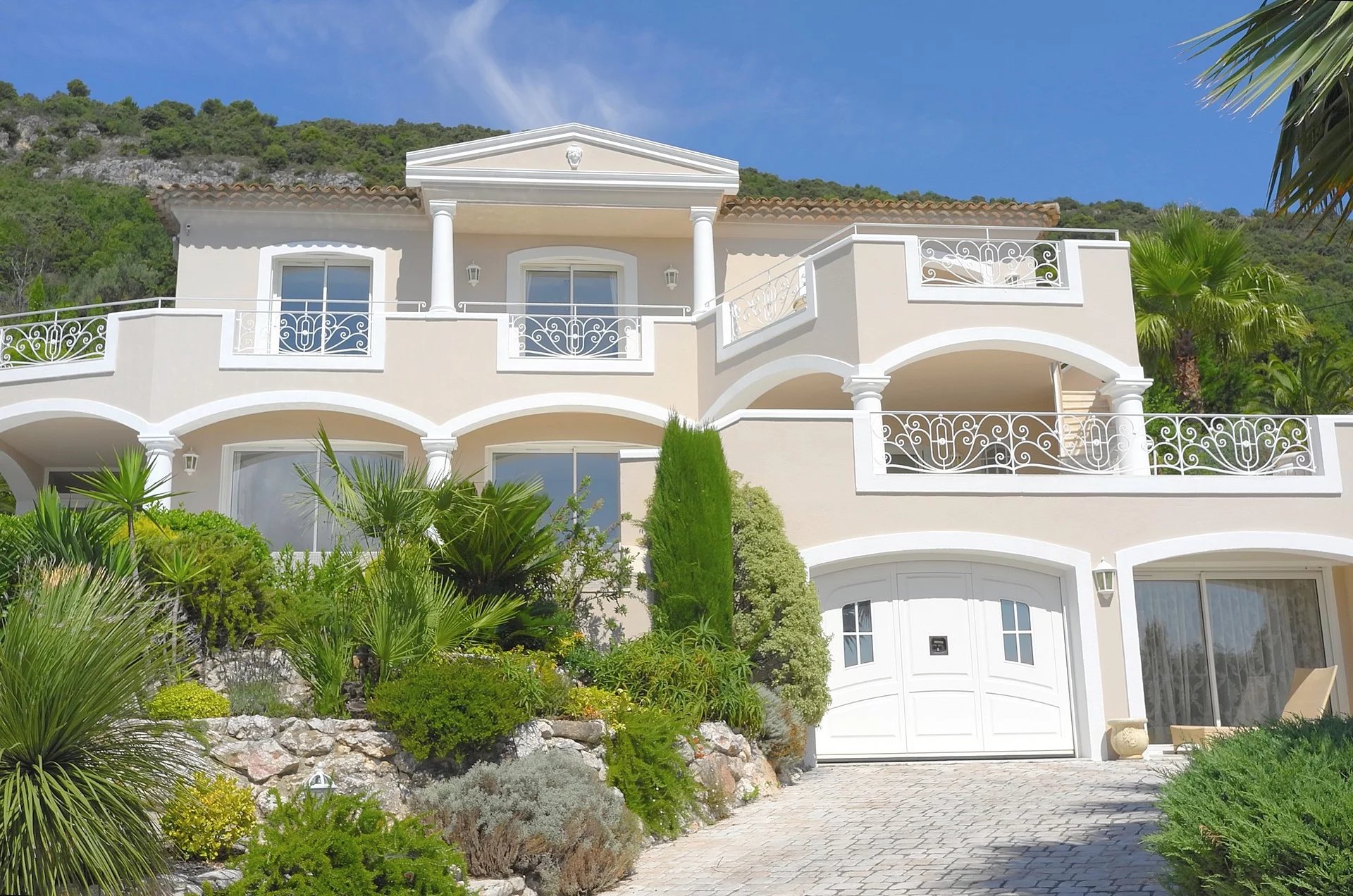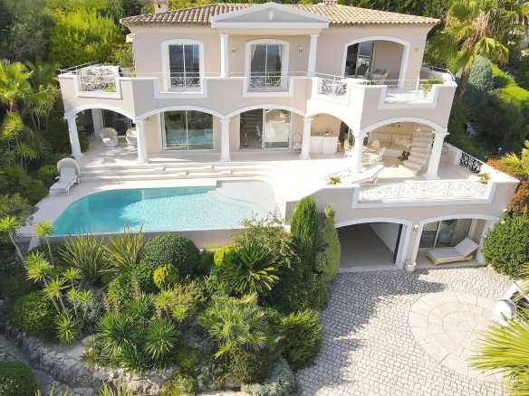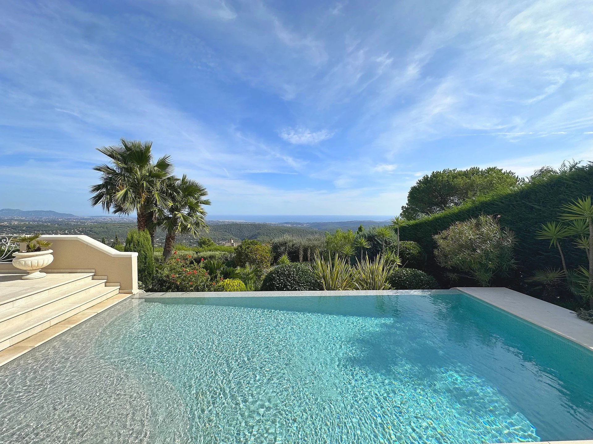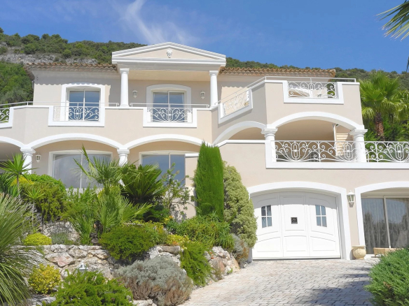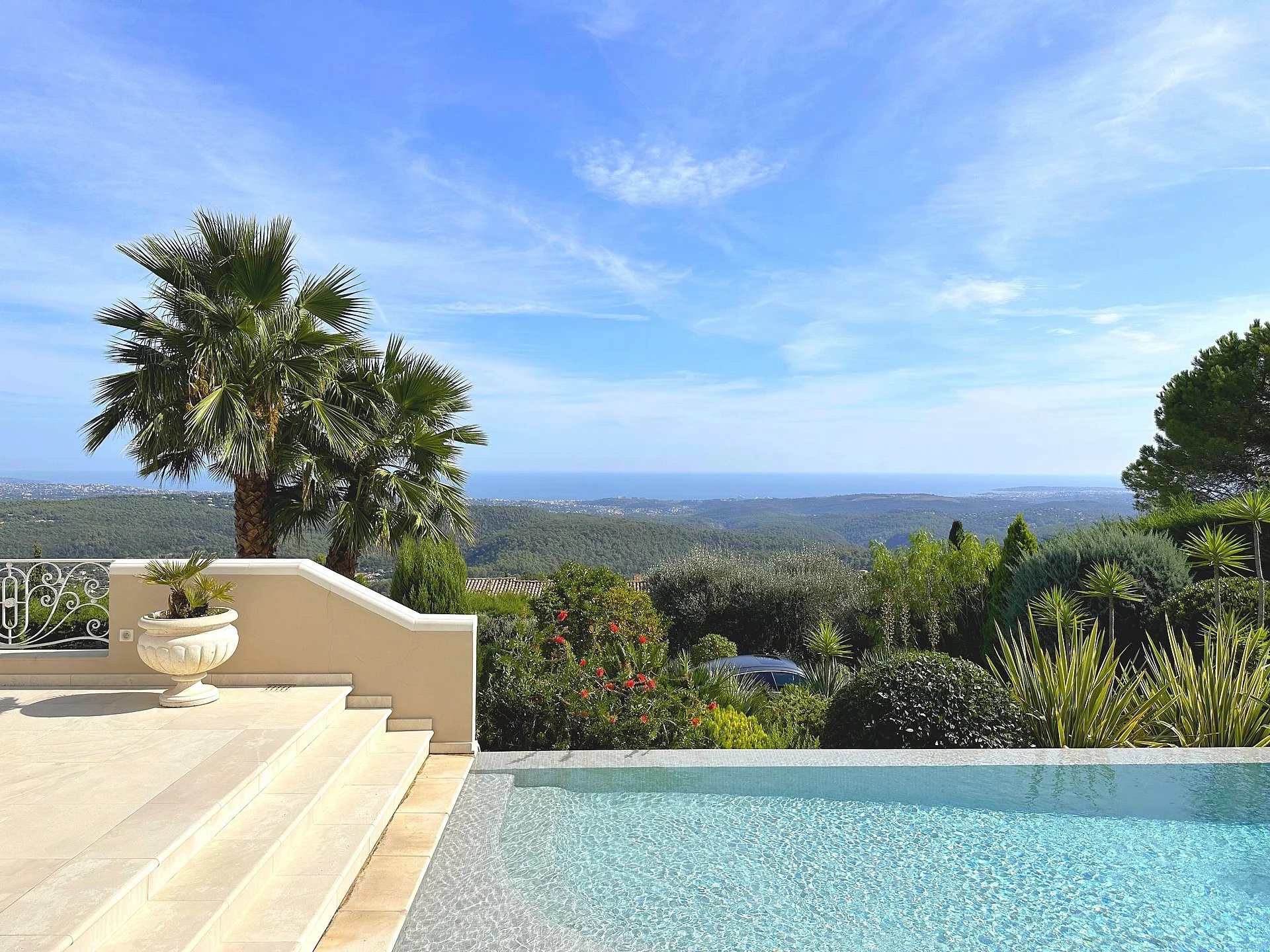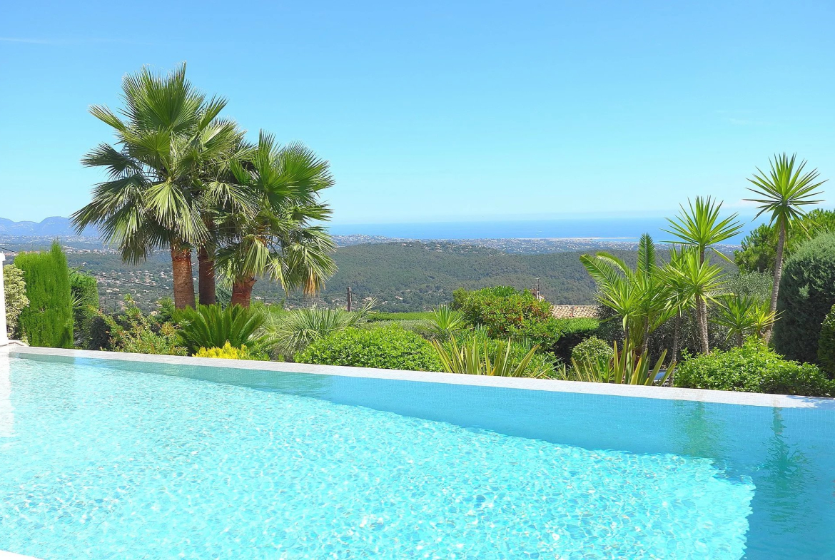 Au sein d’un quartier résidentiel, proche du village, superbe propriété bénéficiant d’une vue panoramique sur la mer et le village de Tourrettes/Loup.
